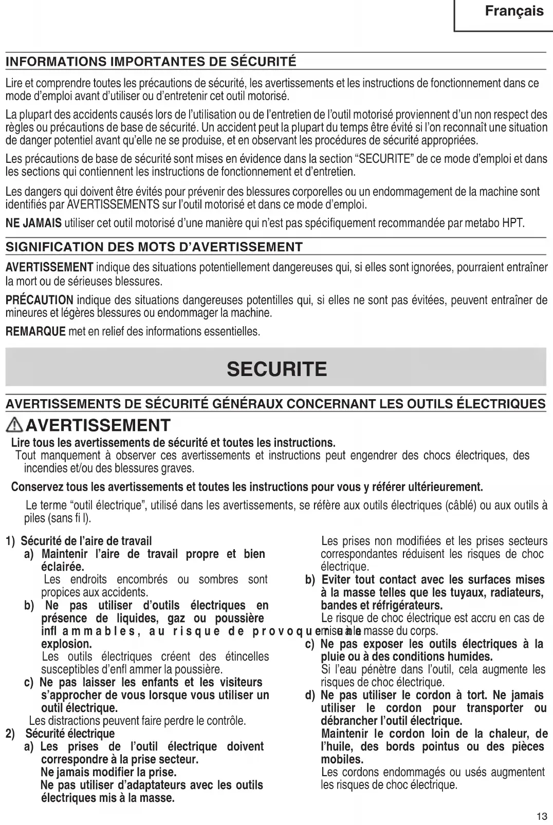 Lire et comprendre toutes les précautions de sécurité, les avertissements et les instructions de fonctionnement dans ce mode d’emploi avant d’utiliser ou d’entretenir cet outil motorisé. La plupart des accidents causés lors de l’utilisation ou de l’entretien de l’outil motorisé proviennent d’un non respect des règles ou précautions de base de sécurité. Un accident peut la plupart du temps être évité si l’on reconnaît une situation de danger potentiel avant qu’elle ne se produise, et en observant les procédures de sécurité appropriées. Les précautions de base de sécurité sont mises en évidence dans la section “SECURITE” de ce mode d’emploi et dans les sections qui contiennent les instructions de fonctionnement et d’entretien. Les dangers qui doivent être évités pour prévenir des blessures corporelles ou un endommagement de la machine sont identifi és par AVERTISSEMENTS sur l’outil motorisé et dans ce mode d’emploi. NE JAMAIS utiliser cet outil motorisé d’une manière qui n’est pas spécifi quement recommandée par metabo HPT.