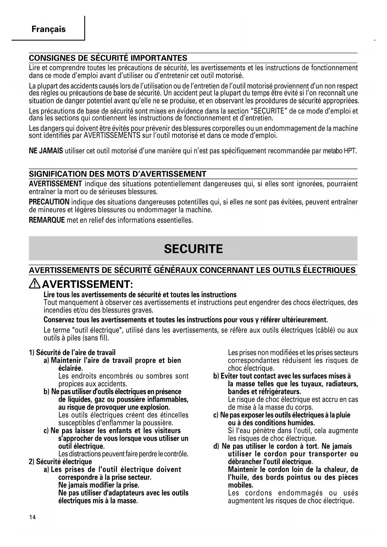 Lire et comprendre toutes les précautions de sécurité, les avertissements et les instructions de fonctionnement dans ce mode d’emploi avant d’utiliser ou d’entretenir cet outil motorisé. La plupart des accidents causés lors de l’utilisation ou de l’entretien de l’outil motorisé proviennent d’un non respect des règles ou précautions de base de sécurité. Un accident peut la plupart du temps être évité si l’on reconnaît une situation de danger potentiel avant qu’elle ne se produise, et en observant les procédures de sécurité appropriées. Les précautions de base de sécurité sont mises en évidence dans la section “SECURITE” de ce mode d’emploi et dans les sections qui contiennent les instructions de fonctionnement et d’entretien. Les dangers qui doivent être évités pour prévenir des blessures corporelles ou un endommagement de la machine sont identifiés par AVERTISSEMENTS sur l’outil motorisé et dans ce mode d’emploi. NE JAMAIS utiliser cet outil motorisé d’une manière qui n’est pas spécifiquement recommandée par metabo HPT.