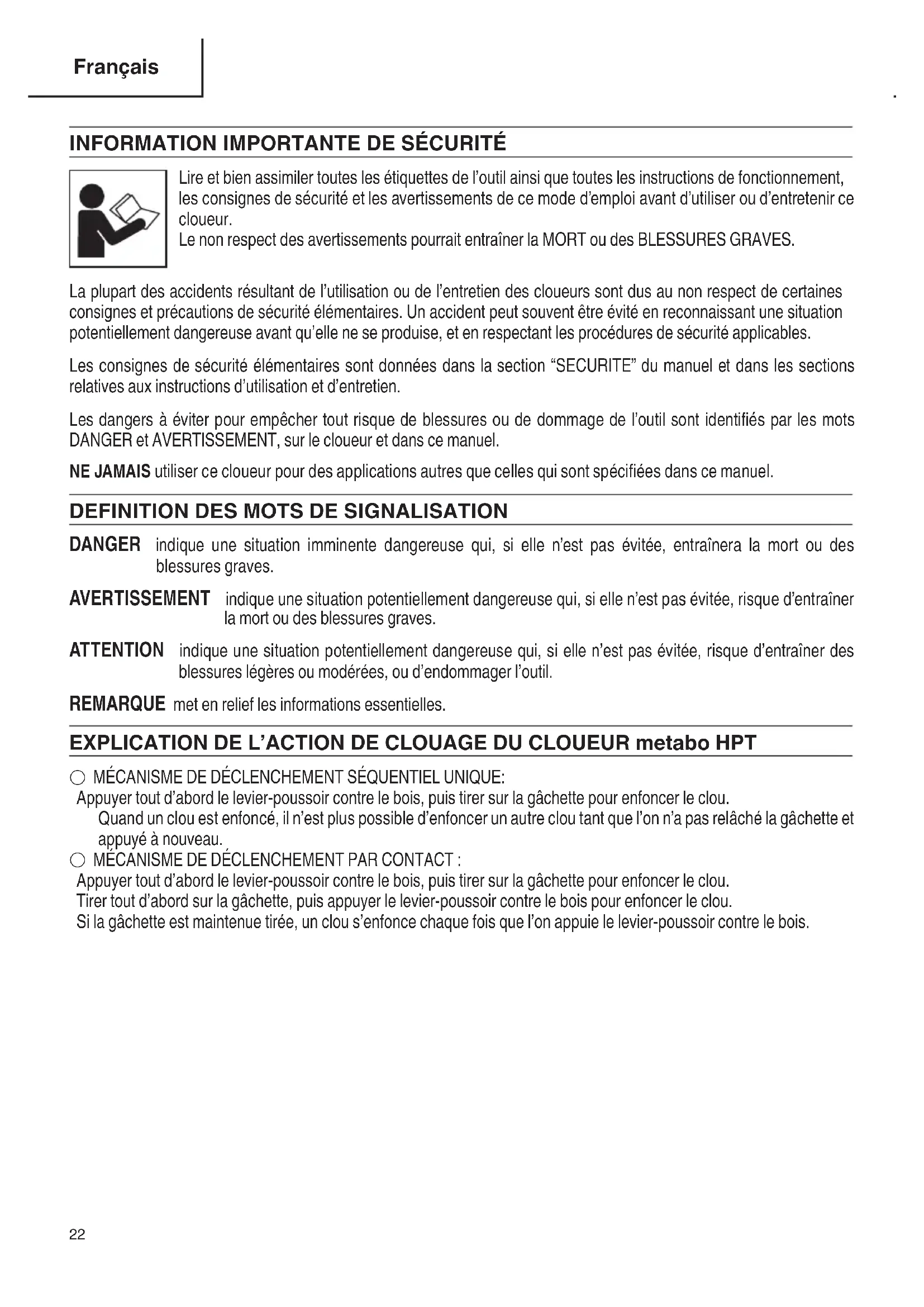 DANGER indique une situation imminente dangereuse qui, si elle n’est pas évitée, entraînera la mort ou des blessures graves. AVERTISSEMENT indique une situation potentiellement dangereuse qui, si elle n’est pas évitée, risque d’entraîner la mort ou des blessures graves. ATTENTION indique une situation potentiellement dangereuse qui, si elle n’est pas évitée, risque d’entraîner des blessures légères ou modérées, ou d’endommager l’outil. REMARQUE met en relief les informations essentielles. EXPLICATION DE L’ACTION DE CLOUAGE DU CLOUEUR metabo HPT