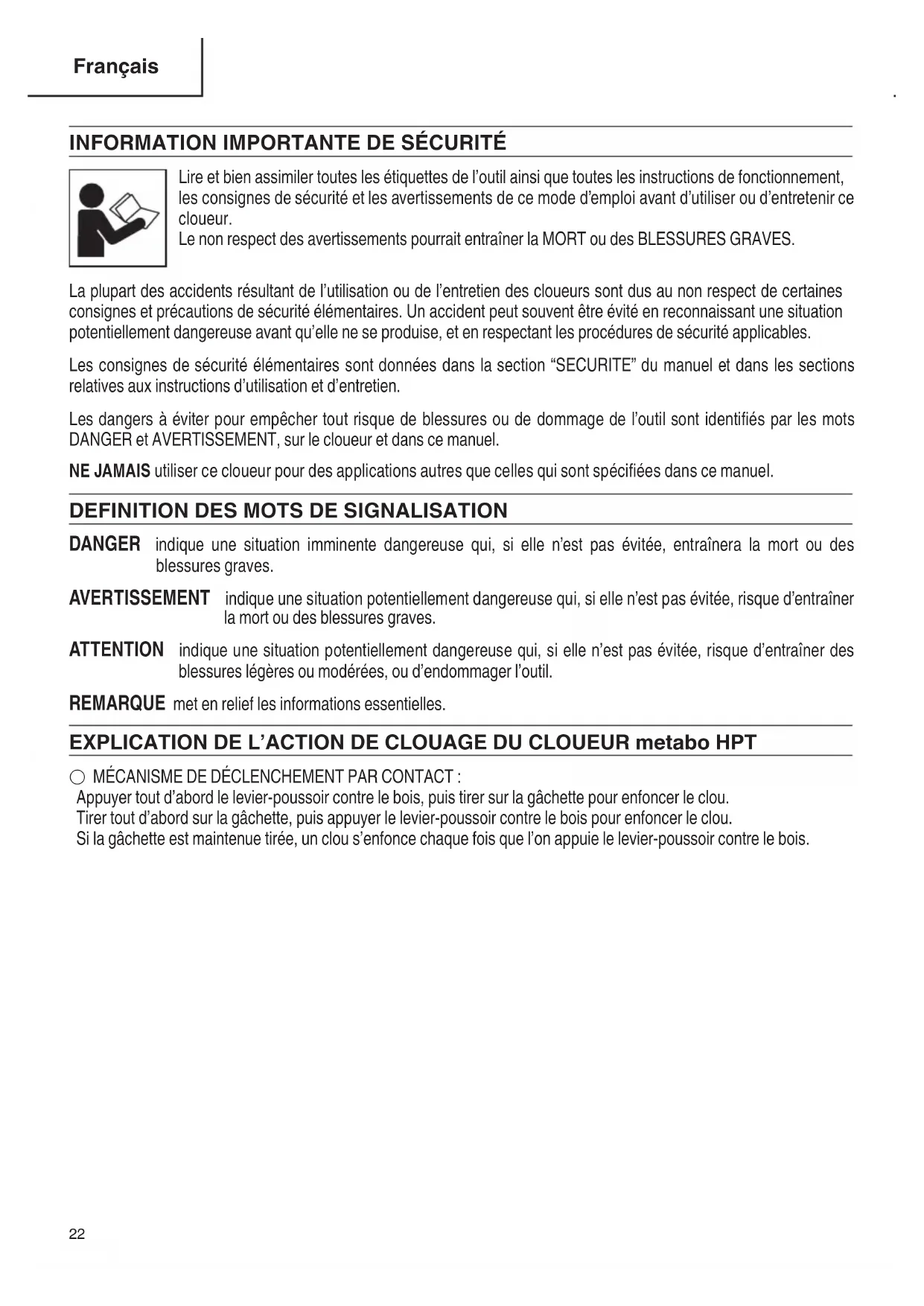 DANGER indique une situation imminente dangereuse qui, si elle n’est pas évitée, entraînera la mort ou des blessures graves. AVERTISSEMENT indique une situation potentiellement dangereuse qui, si elle n’est pas évitée, risque d’entraîner la mort ou des blessures graves. ATTENTION indique une situation potentiellement dangereuse qui, si elle n’est pas évitée, risque d’entraîner des blessures légères ou modérées, ou d’endommager l’outil. REMARQUE met en relief les informations essentielles. EXPLICATION DE L’ACTION DE CLOUAGE DU CLOUEUR metabo HPT