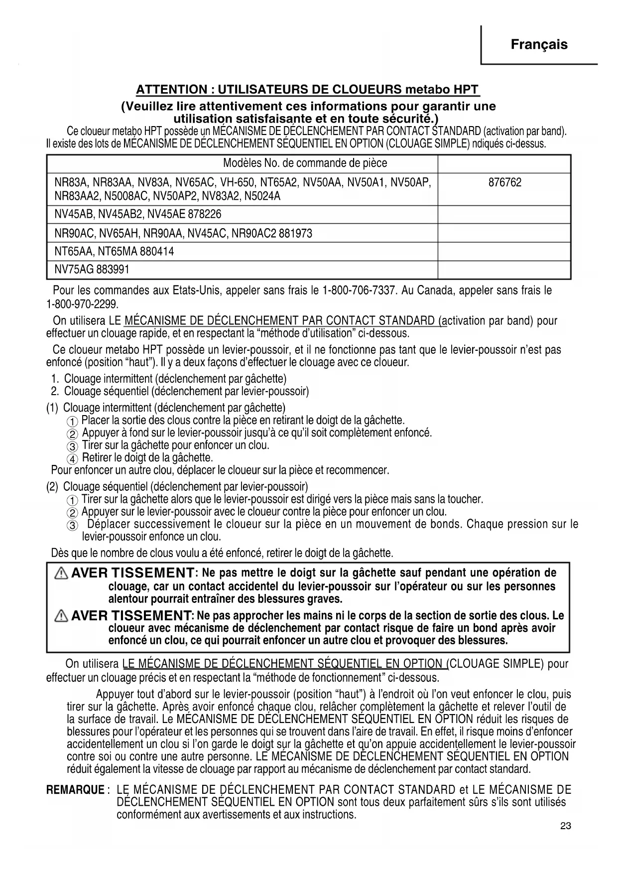 NV45AB, NV45AB2, NV45AE 878226 NR90AC, NV65AH, NR90AA, NV45AC, NR90AC2 881973 NT65AA, NT65MA 880414 NV75AG 883991 Pour les commandes aux Etats-Unis, appeler sans frais le 1-800-706-7337. Au Canada, appeler sans frais le 1-800-970-2299. On utilisera LE MÉCANISME DE DÉCLENCHEMENT PAR CONTACT STANDARD (activation par band) pour eff ectuer un clouage rapide, et en respectant la “méthode d’utilisation” ci-dessous. Ce cloueur metabo HPT possède un levier-poussoir, et il ne fonctionne pas tant que le levier-poussoir n’est pas enfoncé (position “haut”). Il y a deux façons d’eff ectuer le clouage avec ce cloueur.