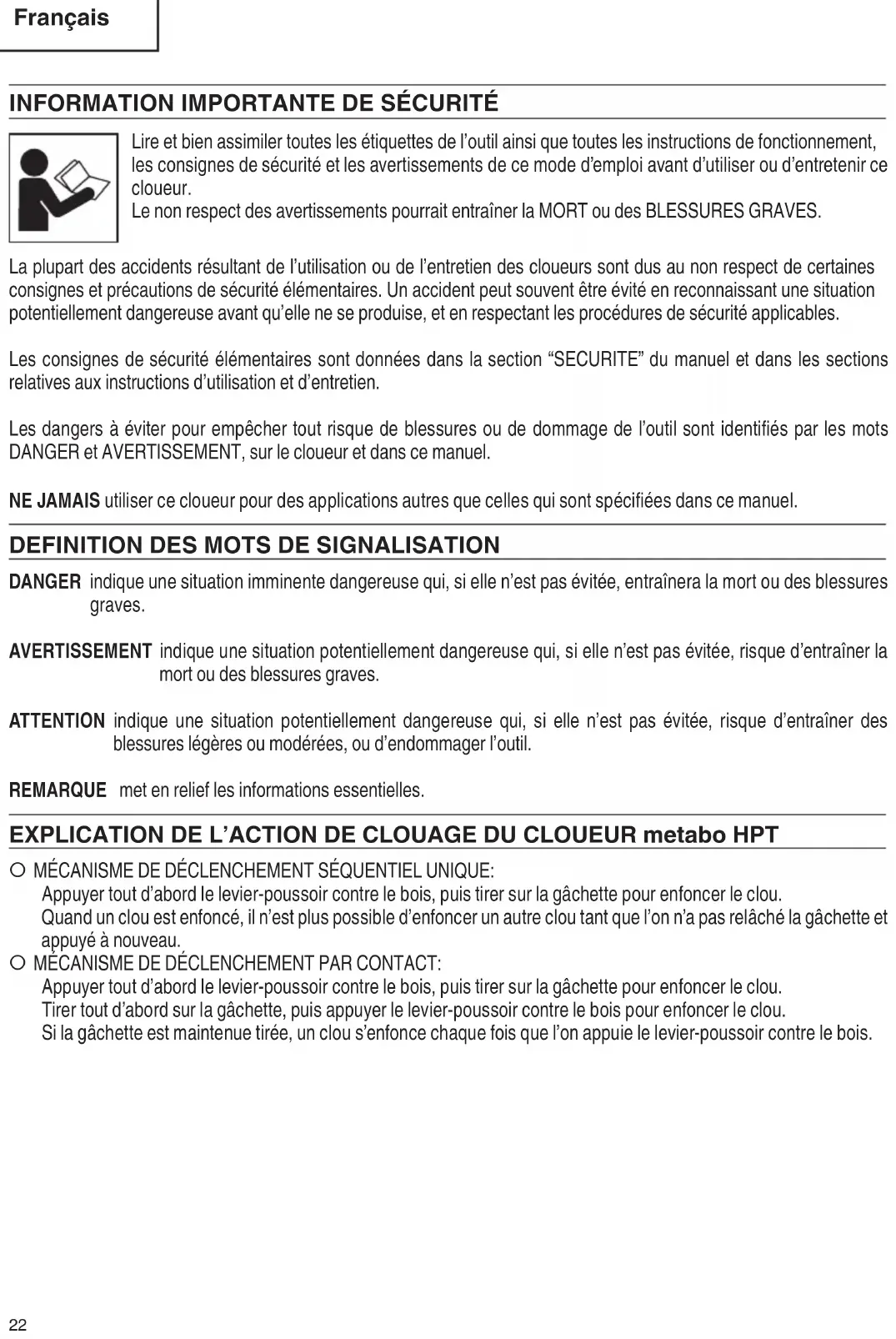 DANGER indique une situation imminente dangereuse qui, si elle n’est pas évitée, entraînera la mort ou des blessures graves. AVERTISSEMENT indique une situation potentiellement dangereuse qui, si elle n’est pas évitée, risque d’entraîner la mort ou des blessures graves. ATTENTION indique une situation potentiellement dangereuse qui, si elle n’est pas évitée, risque d’entraîner des blessures légères ou modérées, ou d’endommager l’outil. REMARQUE met en relief les informations essentielles. EXPLICATION DE L’ACTION DE CLOUAGE DU CLOUEUR metabo HPT