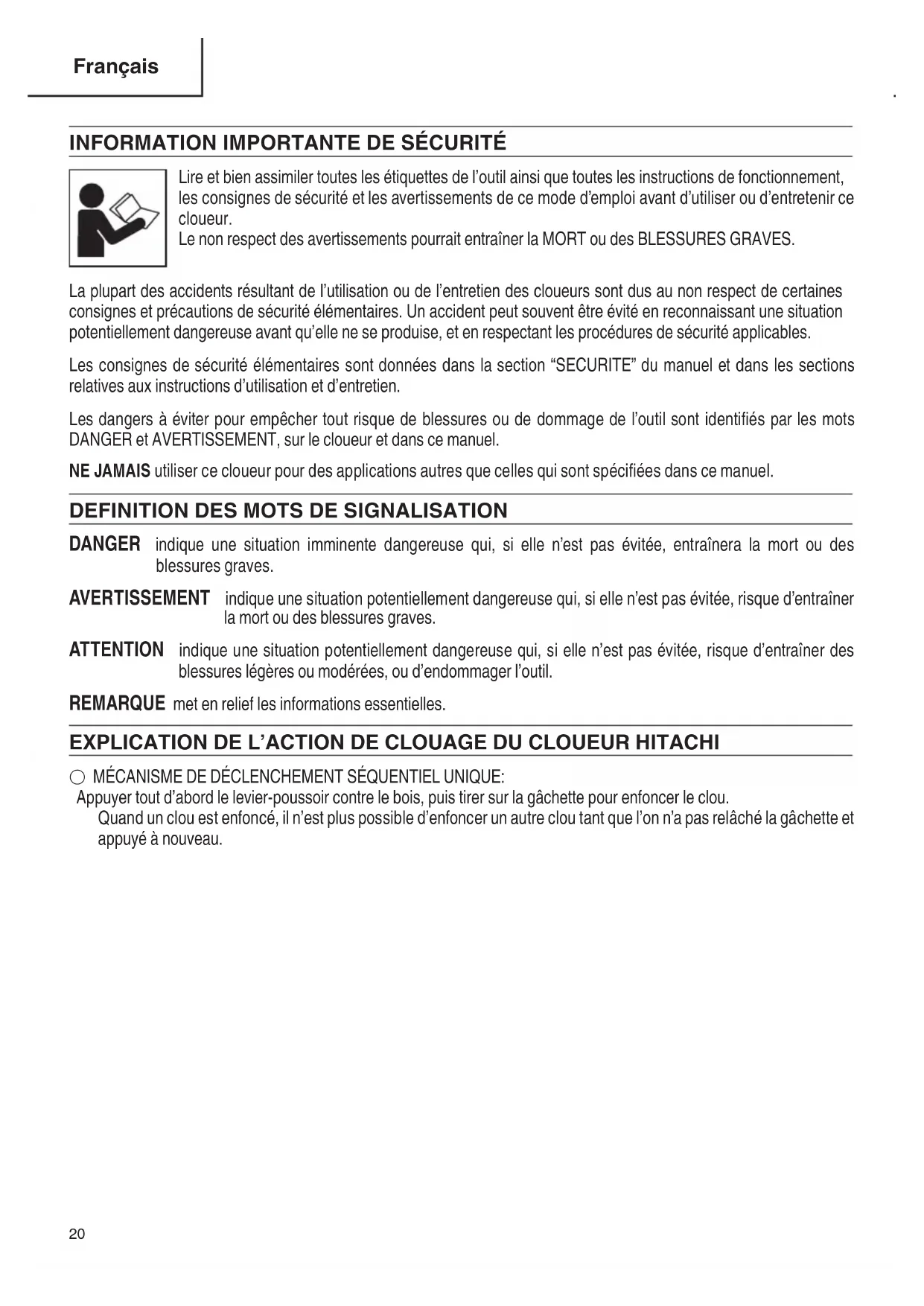 DANGER indique une situation imminente dangereuse qui, si elle n’est pas évitée, entraînera la mort ou des blessures graves. AVERTISSEMENT indique une situation potentiellement dangereuse qui, si elle n’est pas évitée, risque d’entraîner la mort ou des blessures graves. ATTENTION indique une situation potentiellement dangereuse qui, si elle n’est pas évitée, risque d’entraîner des blessures légères ou modérées, ou d’endommager l’outil. REMARQUE met en relief les informations essentielles. EXPLICATION DE L’ACTION DE CLOUAGE DU CLOUEUR HITACHI