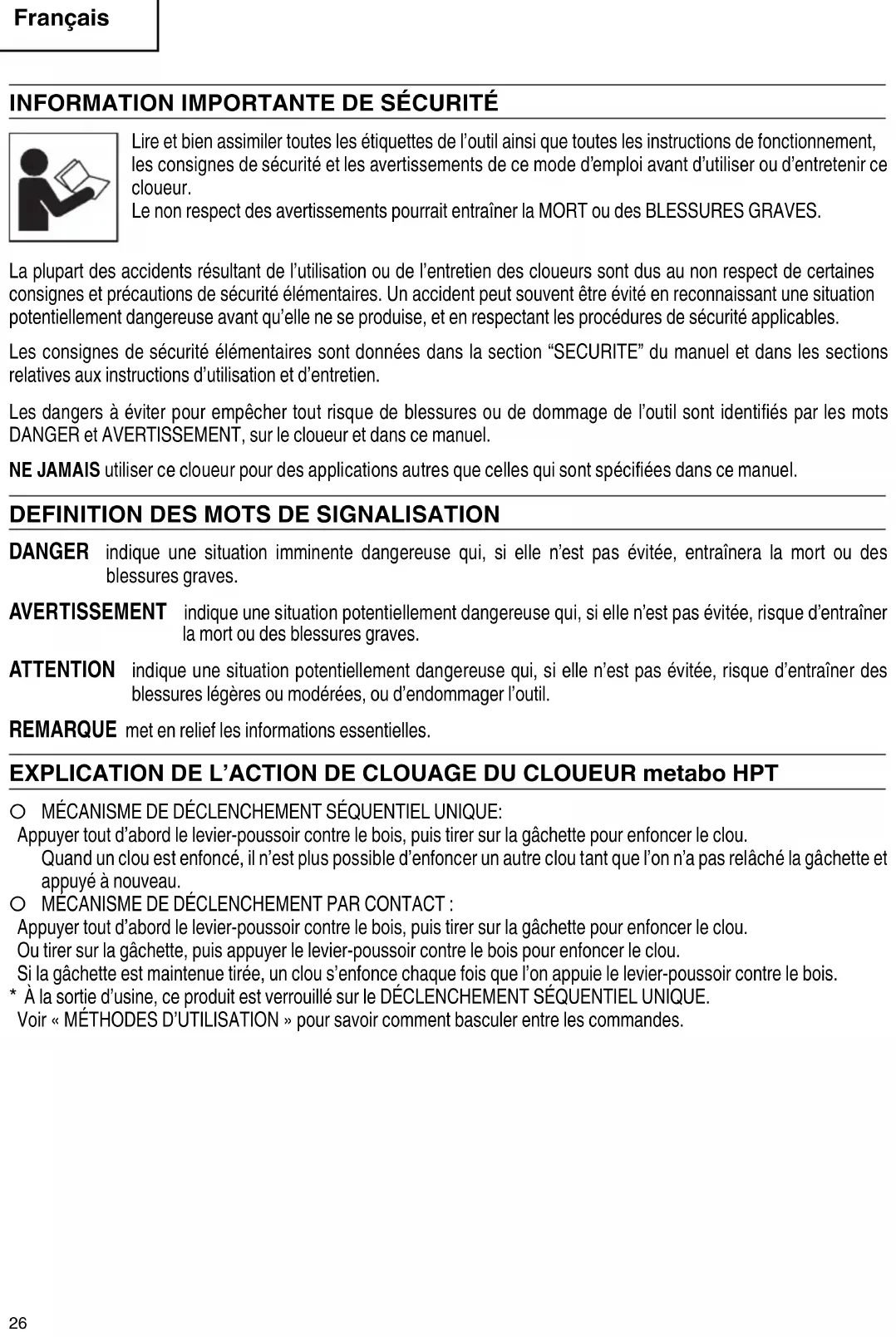 À la sortie d’usine, ce produit est verrouillé sur le DÉCLENCHEMENT SÉQUENTIEL UNIQUE. Voir « MÉTHODES D’UTILISATION » pour savoir comment basculer entre les commandes. 000BookNR83A5USmetabo.indb26000BookNR83A5USmetabo.indb26 2018/05/2213:58:572018/05/2213:58:5727 Français SECURITE CONSIGNES DE SÉCURITÉ IMPORTANTES POUR L’UTILISATION DU CLOUEUR CONSIGNES RELATIVES À UN RISQUE D’INCENDIE, DE CHOC ÉLECTRIQUE OU DE BLESSURES CORPORELLES