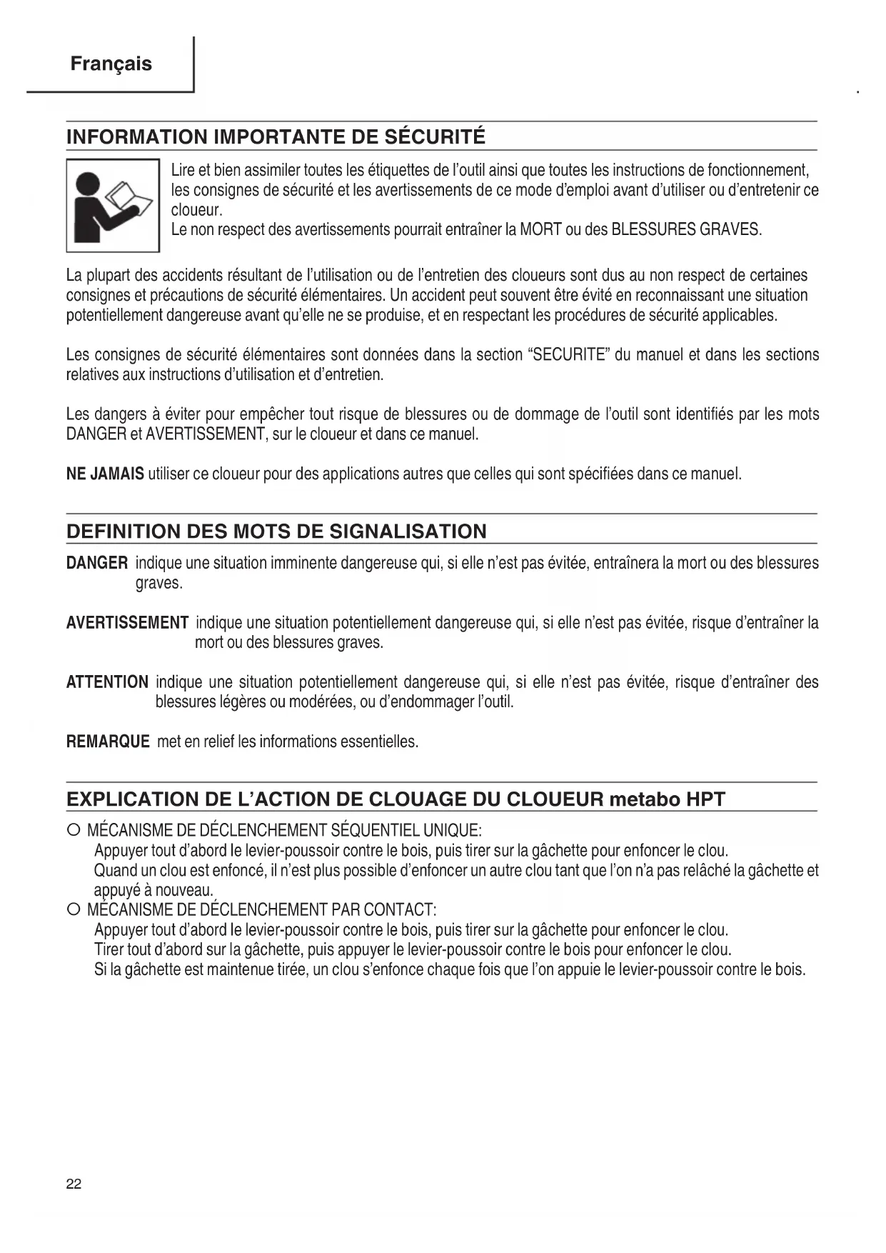 DANGER indique une situation imminente dangereuse qui, si elle n’est pas évitée, entraînera la mort ou des blessures graves. AVERTISSEMENT indique une situation potentiellement dangereuse qui, si elle n’est pas évitée, risque d’entraîner la mort ou des blessures graves. ATTENTION indique une situation potentiellement dangereuse qui, si elle n’est pas évitée, risque d’entraîner des blessures légères ou modérées, ou d’endommager l’outil. REMARQUE met en relief les informations essentielles. EXPLICATION DE L’ACTION DE CLOUAGE DU CLOUEUR metabo HPT