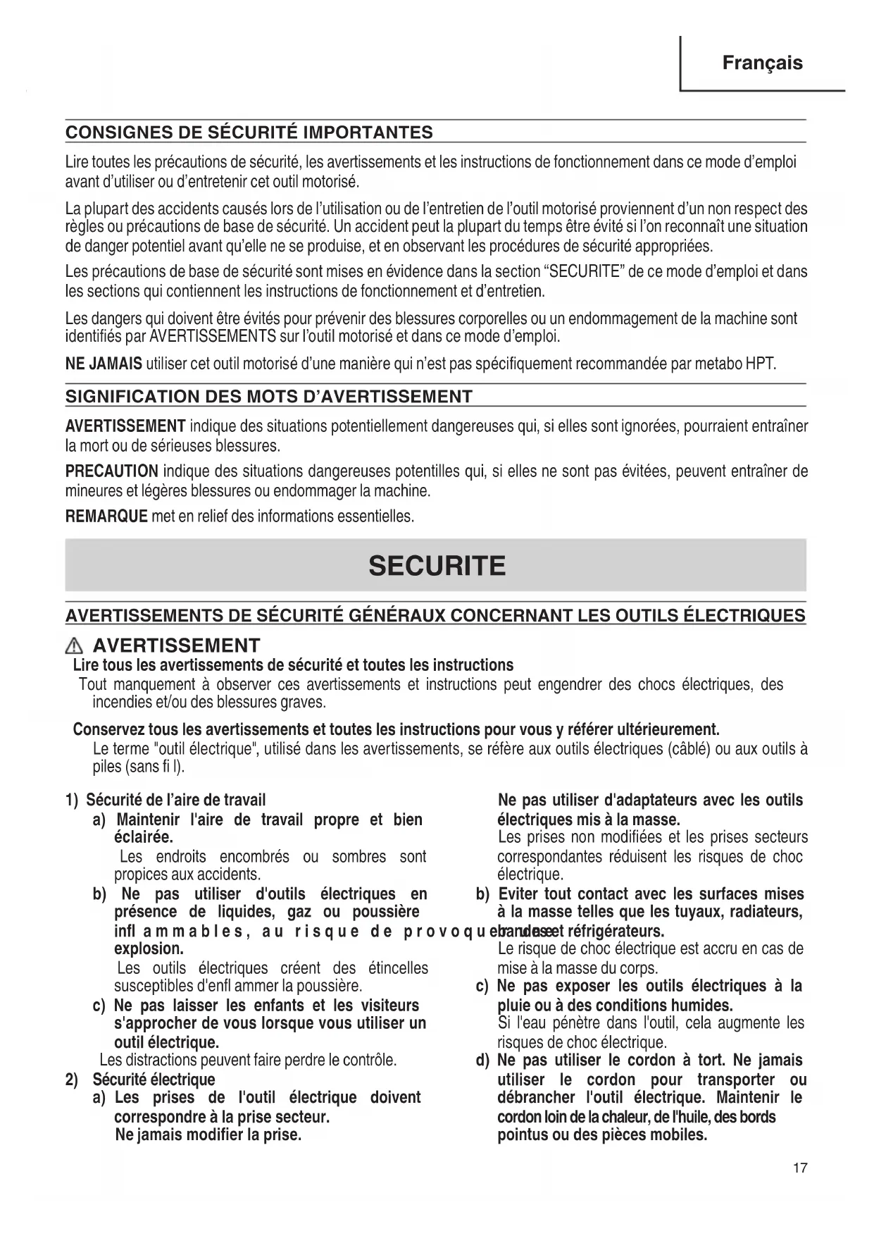 Lire toutes les précautions de sécurité, les avertissements et les instructions de fonctionnement dans ce mode d’emploi avant d’utiliser ou d’entretenir cet outil motorisé. La plupart des accidents causés lors de l’utilisation ou de l’entretien de l’outil motorisé proviennent d’un non respect des règles ou précautions de base de sécurité. Un accident peut la plupart du temps être évité si l’on reconnaît une situation de danger potentiel avant qu’elle ne se produise, et en observant les procédures de sécurité appropriées. Les précautions de base de sécurité sont mises en évidence dans la section “SECURITE” de ce mode d’emploi et dans les sections qui contiennent les instructions de fonctionnement et d’entretien. Les dangers qui doivent être évités pour prévenir des blessures corporelles ou un endommagement de la machine sont identifi és par AVERTISSEMENTS sur l’outil motorisé et dans ce mode d’emploi. NE JAMAIS utiliser cet outil motorisé d’une manière qui n’est pas spécifi quement recommandée par metabo HPT.