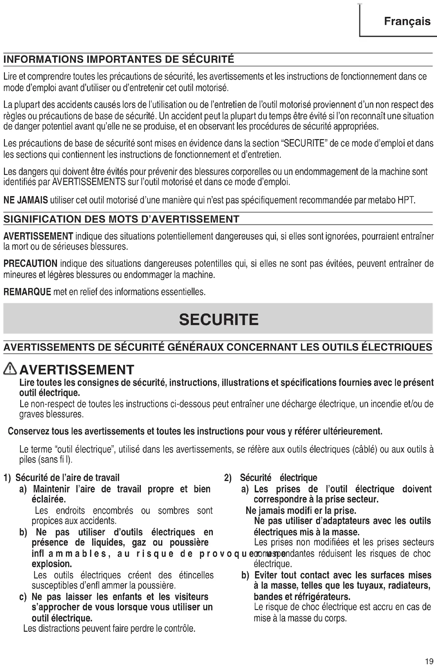 English 00BookW18DANA.indb1800BookW18DANA.indb18 2022/03/1415:37:002022/03/1415:37:00INFORMATIONS IMPORTANTES DE SÉCURITÉ Lire et comprendre toutes les précautions de sécurité, les avertissements et les instructions de fonctionnement dans ce mode d’emploi avant d’utiliser ou d’entretenir cet outil motorisé. La plupart des accidents causés lors de l’utilisation ou de l’entretien de l’outil motorisé proviennent d’un non respect des règles ou précautions de base de sécurité. Un accident peut la plupart du temps être évité si l’on reconnaît une situation de danger potentiel avant qu’elle ne se produise, et en observant les procédures de sécurité appropriées. Les précautions de base de sécurité sont mises en évidence dans la section “SECURITE” de ce mode d’emploi et dans les sections qui contiennent les instructions de fonctionnement et d’entretien. Les dangers qui doivent être évités pour prévenir des blessures corporelles ou un endommagement de la machine sont identifi és par AVERTISSEMENTS sur l’outil motorisé et dans ce mode d’emploi. NE JAMAIS utiliser cet outil motorisé d’une manière qui n’est pas spécifi quement recommandée par metabo HPT.