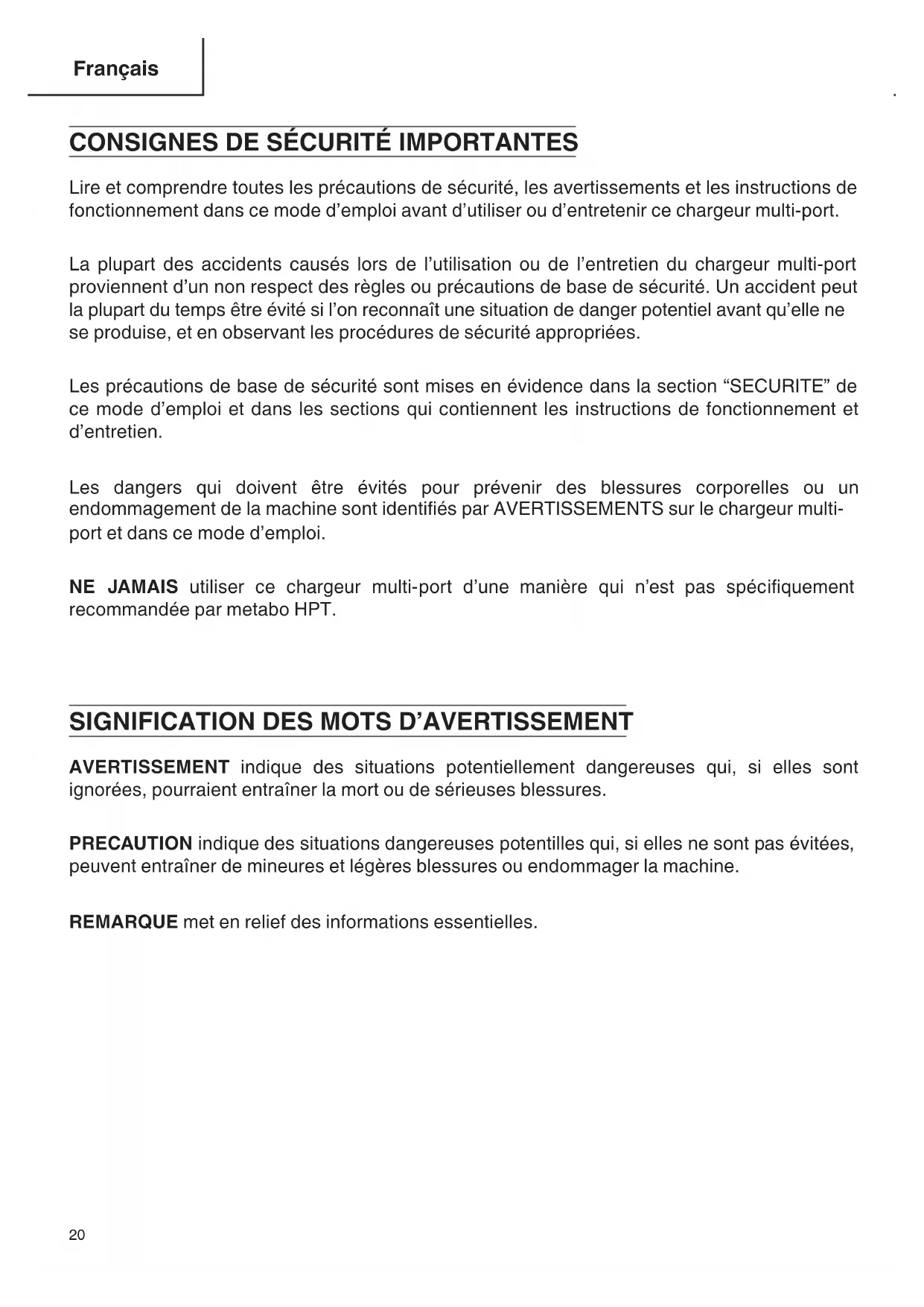 English 000Book_UC18YTSL_US_metabo.indb 19 2019/03/28 15:40:54CONSIGNES DE SÉCURITÉ IMPORTANTES Lire et comprendre toutes les précautions de sécurité, les avertissements et les instructions de fonctionnement dans ce mode d’emploi avant d’utiliser ou d’entretenir ce chargeur multi-port. La plupart des accidents causés lors de l’utilisation ou de l’entretien du chargeur multi-port proviennent d’un non respect des règles ou précautions de base de sécurité. Un accident peut la plupart du temps être évité si l’on reconnaît une situation de danger potentiel avant qu’elle ne se produise, et en observant les procédures de sécurité appropriées. Les précautions de base de sécurité sont mises en évidence dans la section “SECURITE” de ce mode d’emploi et dans les sections qui contiennent les instructions de fonctionnement et d’entretien. Les dangers qui doivent être évités pour prévenir des blessures corporelles ou un endommagement de la machine sont identiés par AVERTISSEMENTS sur le chargeur multi- port et dans ce mode d’emploi. NE JAMAIS utiliser ce chargeur multi-port d’une manière qui n’est pas spéciquement recommandée par metabo HPT.