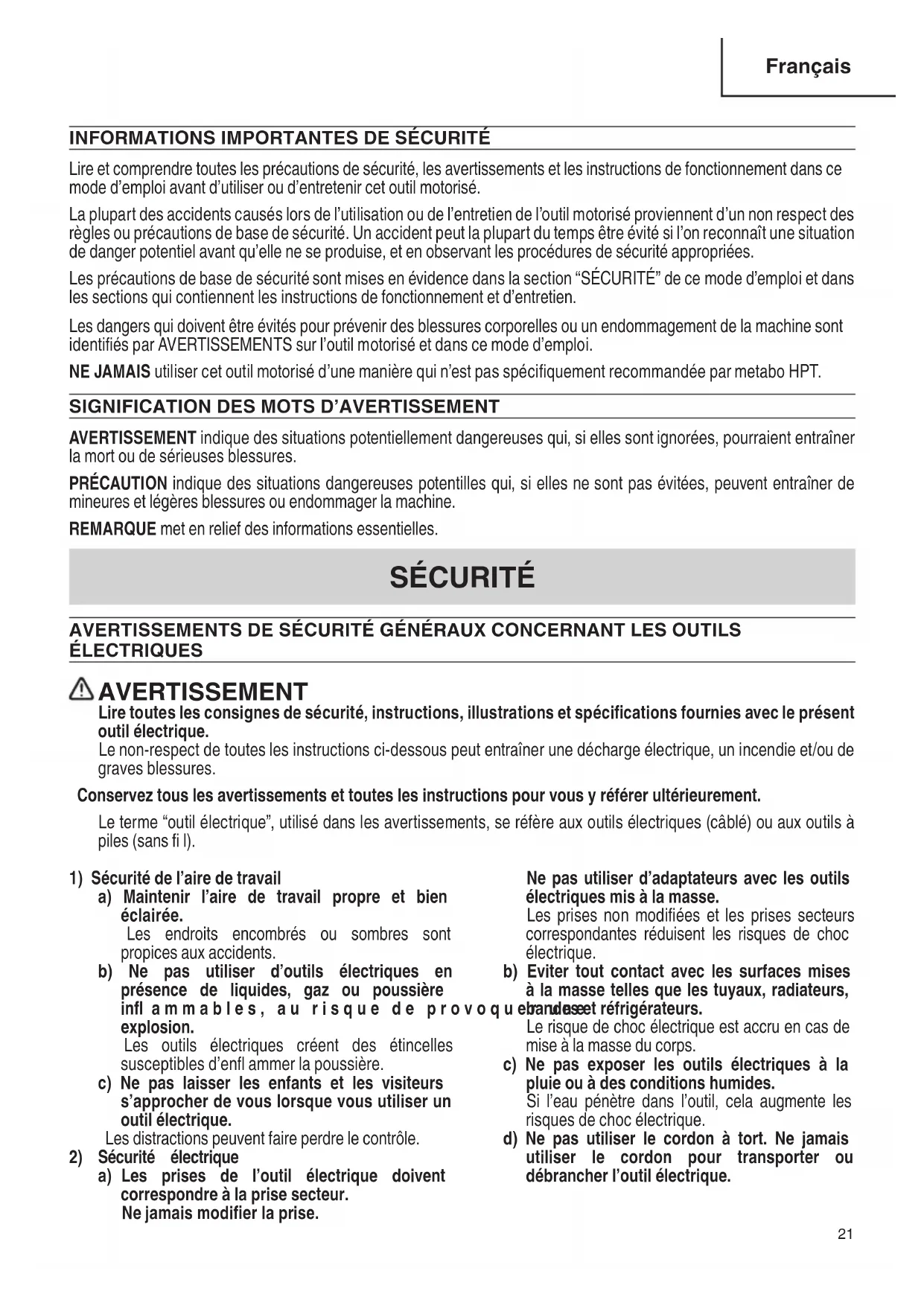 Lire et comprendre toutes les précautions de sécurité, les avertissements et les instructions de fonctionnement dans ce mode d’emploi avant d’utiliser ou d’entretenir cet outil motorisé. La plupart des accidents causés lors de l’utilisation ou de l’entretien de l’outil motorisé proviennent d’un non respect des règles ou précautions de base de sécurité. Un accident peut la plupart du temps être évité si l’on reconnaît une situation de danger potentiel avant qu’elle ne se produise, et en observant les procédures de sécurité appropriées. Les précautions de base de sécurité sont mises en évidence dans la section “SÉCURITÉ” de ce mode d’emploi et dans les sections qui contiennent les instructions de fonctionnement et d’entretien. Les dangers qui doivent être évités pour prévenir des blessures corporelles ou un endommagement de la machine sont identifi és par AVERTISSEMENTS sur l’outil motorisé et dans ce mode d’emploi. NE JAMAIS utiliser cet outil motorisé d’une manière qui n’est pas spécifi quement recommandée par metabo HPT.