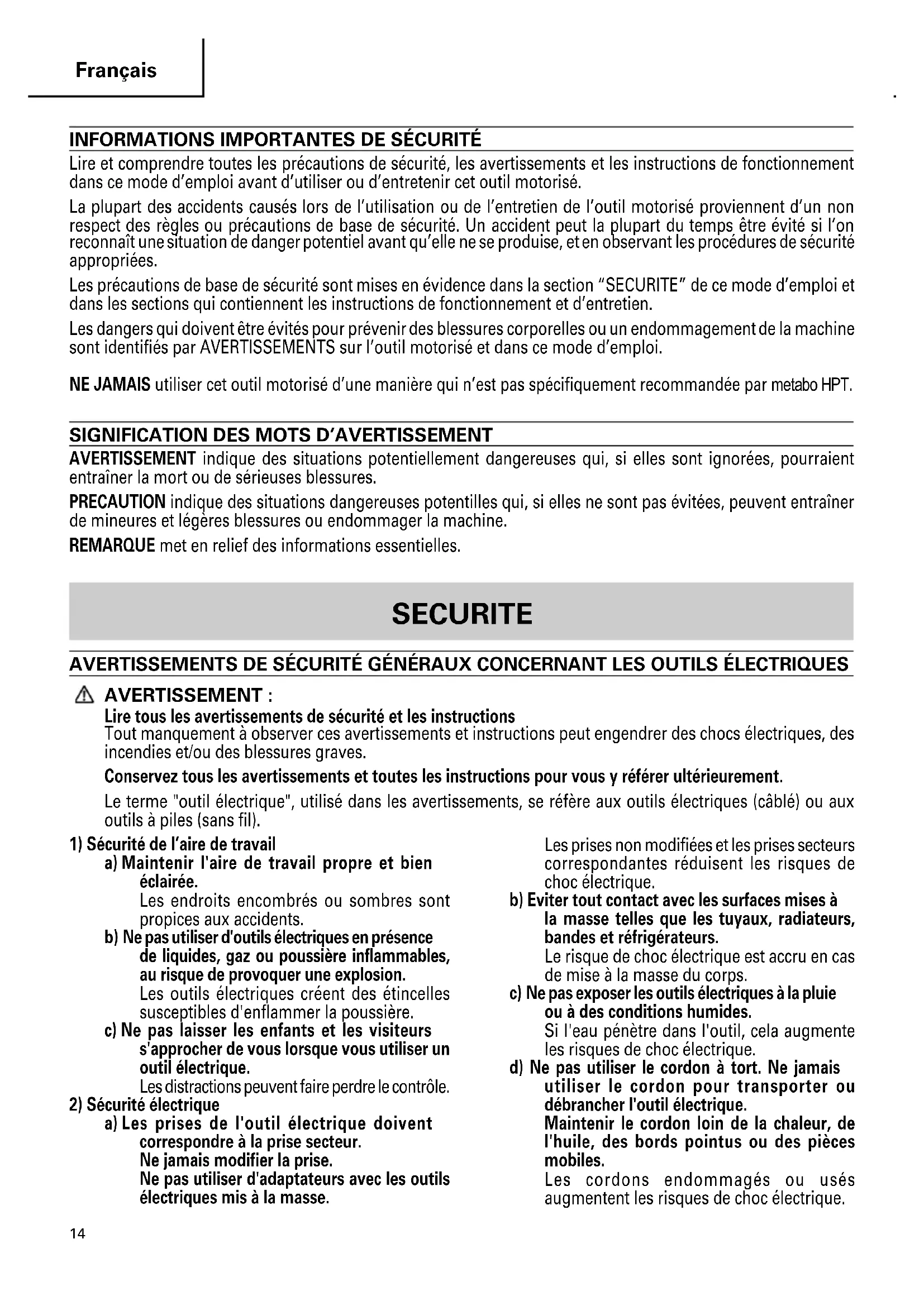 Lire et comprendre toutes les précautions de sécurité, les avertissements et les instructions de fonctionnement dans ce mode d’emploi avant d’utiliser ou d’entretenir cet outil motorisé. La plupart des accidents causés lors de l’utilisation ou de l’entretien de l’outil motorisé proviennent d’un non respect des règles ou précautions de base de sécurité. Un accident peut la plupart du temps être évité si l’on reconnaît une situation de danger potentiel avant qu’elle ne se produise, et en observant les procédures de sécurité appropriées. Les précautions de base de sécurité sont mises en évidence dans la section “SECURITE” de ce mode d’emploi et dans les sections qui contiennent les instructions de fonctionnement et d’entretien. Les dangers qui doivent être évités pour prévenir des blessures corporelles ou un endommagement de la machine sont identifiés par AVERTISSEMENTS sur l’outil motorisé et dans ce mode d’emploi. NE JAMAIS utiliser cet outil motorisé d’une manière qui n’est pas spécifiquement recommandée par metabo HPT.