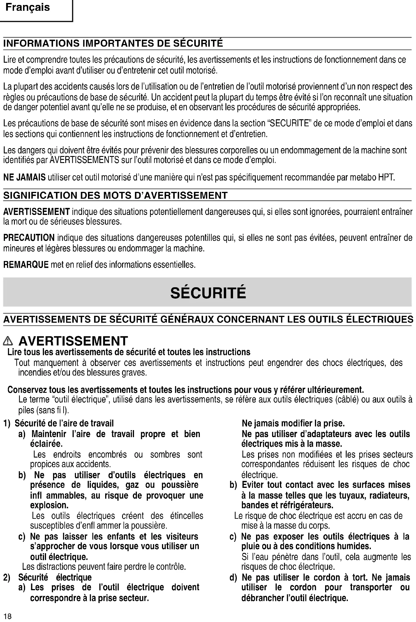 English 000BookDN18DSLUS.indb17000BookDN18DSLUS.indb17 2018/10/2414:08:472018/10/2414:08:47INFORMATIONS IMPORTANTES DE SÉCURITÉ Lire et comprendre toutes les précautions de sécurité, les avertissements et les instructions de fonctionnement dans ce mode d’emploi avant d’utiliser ou d’entretenir cet outil motorisé. La plupart des accidents causés lors de l’utilisation ou de l’entretien de l’outil motorisé proviennent d’un non respect des règles ou précautions de base de sécurité. Un accident peut la plupart du temps être évité si l’on reconnaît une situation de danger potentiel avant qu’elle ne se produise, et en observant les procédures de sécurité appropriées. Les précautions de base de sécurité sont mises en évidence dans la section “SECURITE” de ce mode d’emploi et dans les sections qui contiennent les instructions de fonctionnement et d’entretien. Les dangers qui doivent être évités pour prévenir des blessures corporelles ou un endommagement de la machine sont identifi és par AVERTISSEMENTS sur l’outil motorisé et dans ce mode d’emploi. NE JAMAIS utiliser cet outil motorisé d’une manière qui n’est pas spécifi quement recommandée par metabo HPT.