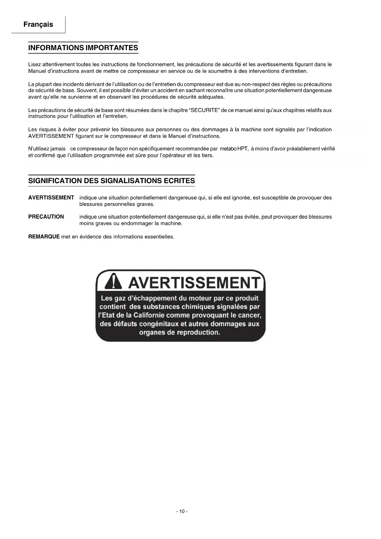 All quality compressors will eventually require servicing or replacement of parts because of wear and tear from normal use. To assure that only authorized/genuine replacement parts will be used, all service and repairs must be performed by a metabo HPT AUTHORIZED SERVICE CENTER, only. NOTE: Specifications are subject to change without any obligation on the part of the metabo HPT.- 10 - Français INFORMATIONS IMPORTANTES Lisez attentivement toutes les instructions de fonctionnement, les précautions de sécurité et les avertissements figurant dans le Manuel d’instructions avant de mettre ce compresseur en service ou de le soumettre à des interventions d’entretien. La plupart des incidents dérivant de l’utilisation ou de l’entretien du compresseur est due au non-respect des règles ou précautions de sécurité de base. Souvent, il est possible d’éviter un accident en sachant reconnaître une situation potentiellement dangereuse avant qu’elle ne survienne et en observant les procédures de sécurité adéquates. Les précautions de sécurité de base sont résumées dans le chapitre “SECURITE” de ce manuel ainsi qu’aux chapitres relatifs aux instructions pour l’utilisation et l’entretien. Les risques à éviter pour prévenir les blessures aux personnes ou des dommages à la machine sont signalés par l’indication AVERTISSEMENT figurant sur le compresseur et dans le Manuel d’instructions. N’utilisez jamais ce compresseur de façon non spécifiquement recommandée par metabo HPT, à moins d’avoir préalablement vérifié et confirmé que l’utilisation programmée est sûre pour l’opérateur et les tiers.