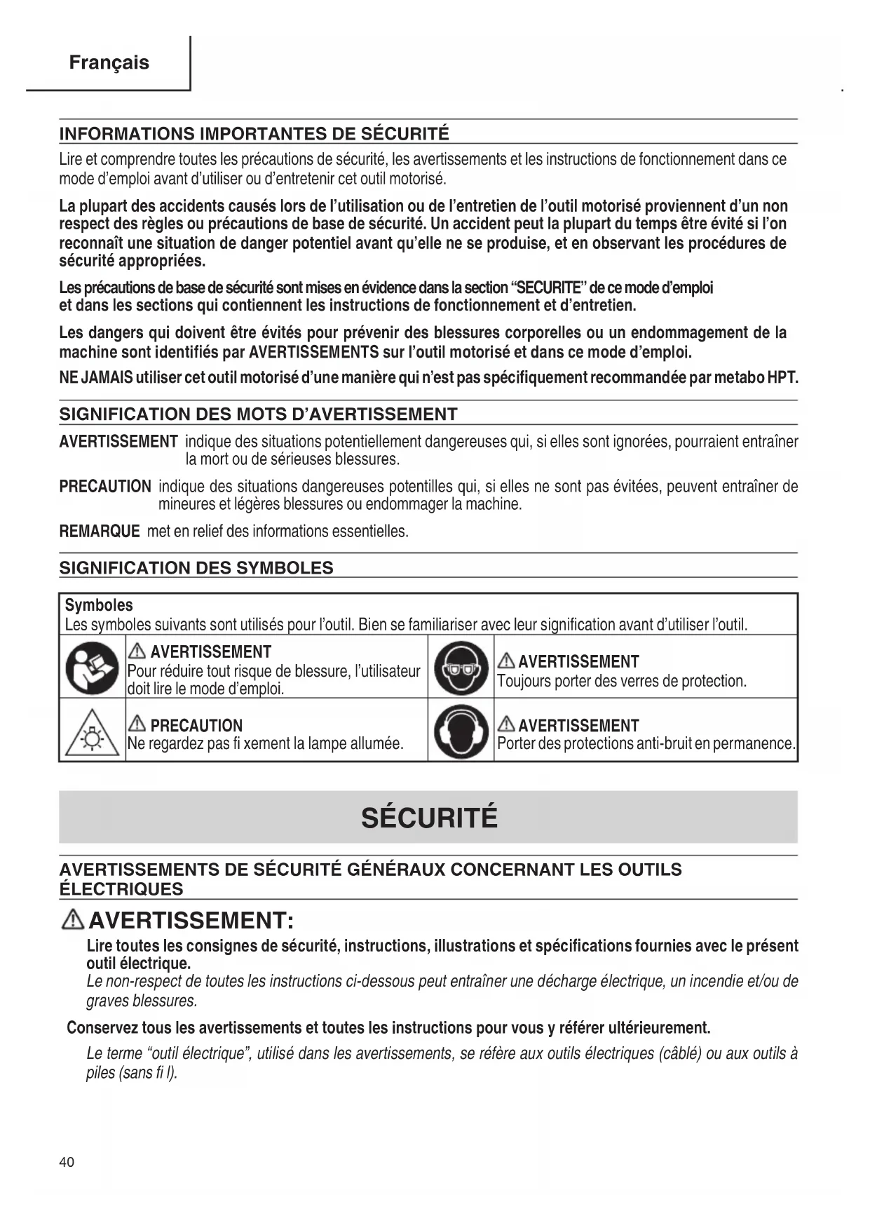 Lire et comprendre toutes les précautions de sécurité, les avertissements et les instructions de fonctionnement dans ce mode d’emploi avant d’utiliser ou d’entretenir cet outil motorisé. La plupart des accidents causés lors de l’utilisation ou de l’entretien de l’outil motorisé proviennent d’un non respect des règles ou précautions de base de sécurité. Un accident peut la plupart du temps être évité si l’on reconnaît une situation de danger potentiel avant qu’elle ne se produise, et en observant les procédures de sécurité appropriées. Les précautions de base de sécurité sont mises en évidence dans la section “SECURITE” de ce mode d’emploi et dans les sections qui contiennent les instructions de fonctionnement et d’entretien. Les dangers qui doivent être évités pour prévenir des blessures corporelles ou un endommagement de la machine sont identifi és par AVERTISSEMENTS sur l’outil motorisé et dans ce mode d’emploi. NE JAMAIS utiliser cet outil motorisé d’une manière qui n’est pas spécifi quement recommandée par metabo HPT.