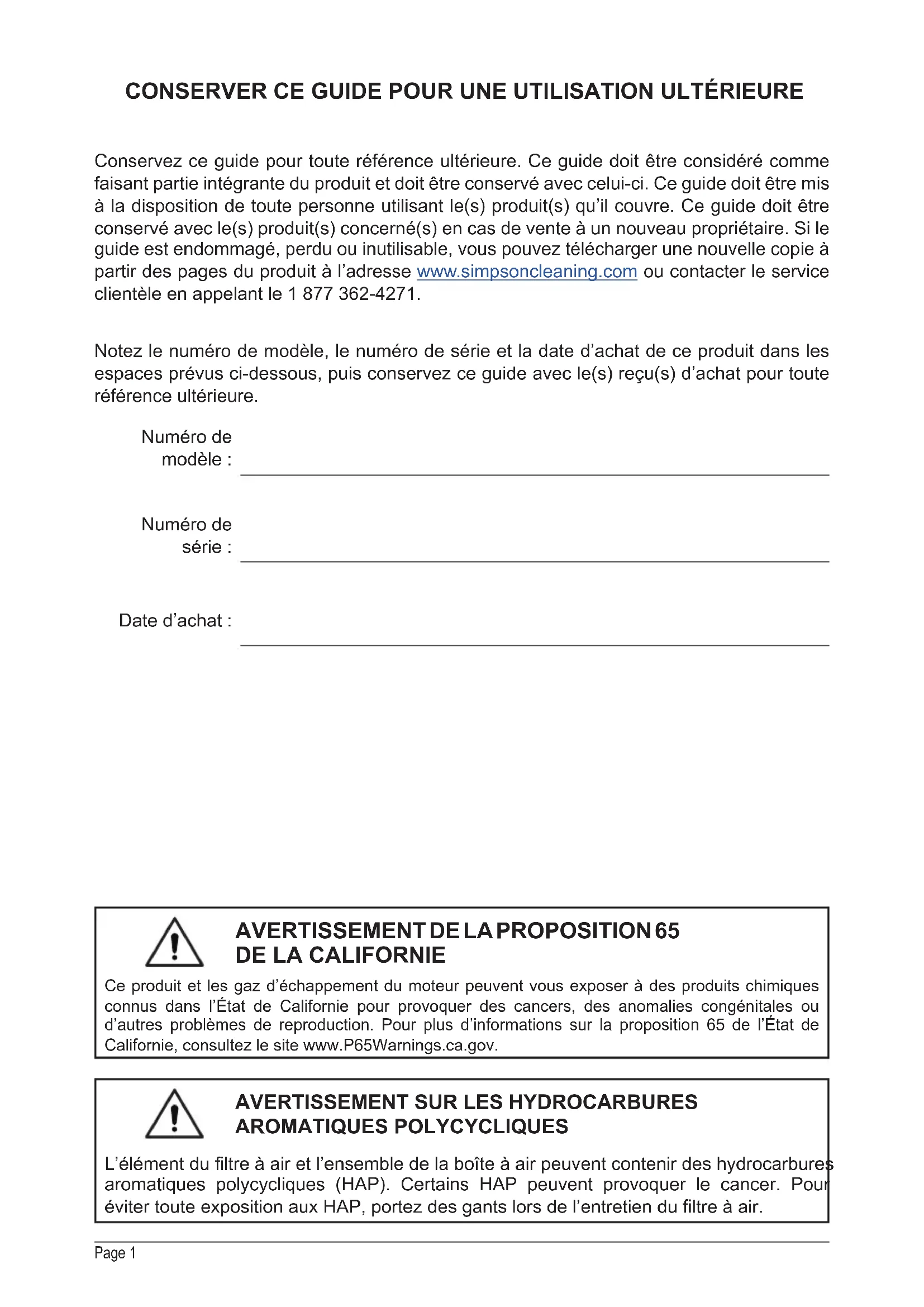 LIRE ATTENTIVEMENT CE GUIDE AVANT L’UTILISATION Le fait de ne pas suivre les instructions et les précautions de sécurité de ce guide peut entraîner des dommages matériels, des blessures graves et/ou la mort. REMARQUE : Les photographies et les schémas utilisés dans ce guide sont donnés à titre indicatif uniquement et peuvent ne pas représenter votre modèle spécique.Si le laveur sous pression ne fonctionne pas ou si des pièces sont manquantes ou endommagées, veuillez NE PAS LE RETOURNER AU LIEU D’ACHAT. Contactez notre service à la clientèle par téléphone au 1 877 362-4271 ou par courriel à cservice@fna-group.com REGARDEZ AVANT DE POMPER! Pourcentage d'éthanolPage II REMARQUES CETTE PAGE A ÉTÉ INTENTIONNELLEMENT LAISSÉE BLANCHEPage 1 CONSERVER CE GUIDE POUR UNE UTILISATION ULTÉRIEURE Notez le numéro de modèle, le numéro de série et la date d’achat de ce produit dans les espaces prévus ci-dessous, puis conservez ce guide avec le(s) reçu(s) d’achat pour toute référence ultérieure. Conservez ce guide pour toute référence ultérieure. Ce guide doit être considéré comme faisant partie intégrante du produit et doit être conservé avec celui-ci. Ce guide doit être mis à la disposition de toute personne utilisant le(s) produit(s) qu’il couvre. Ce guide doit être conservé avec le(s) produit(s) concerné(s) en cas de vente à un nouveau propriétaire. Si le guide est endommagé, perdu ou inutilisable, vous pouvez télécharger une nouvelle copie à partir des pages du produit à l’adresse www.simpsoncleaning.com ou contacter le service clientèle en appelant le 1 877 362-4271. Numéro de modèle : Numéro de série : Date d’achat : Ce produit et les gaz d’échappement du moteur peuvent vous exposer à des produits chimiques connus dans l’État de Californie pour provoquer des cancers, des anomalies congénitales ou d’autres problèmes de reproduction. Pour plus d’informations sur la proposition 65 de l’État de Californie, consultez le site www.P65Warnings.ca.gov.