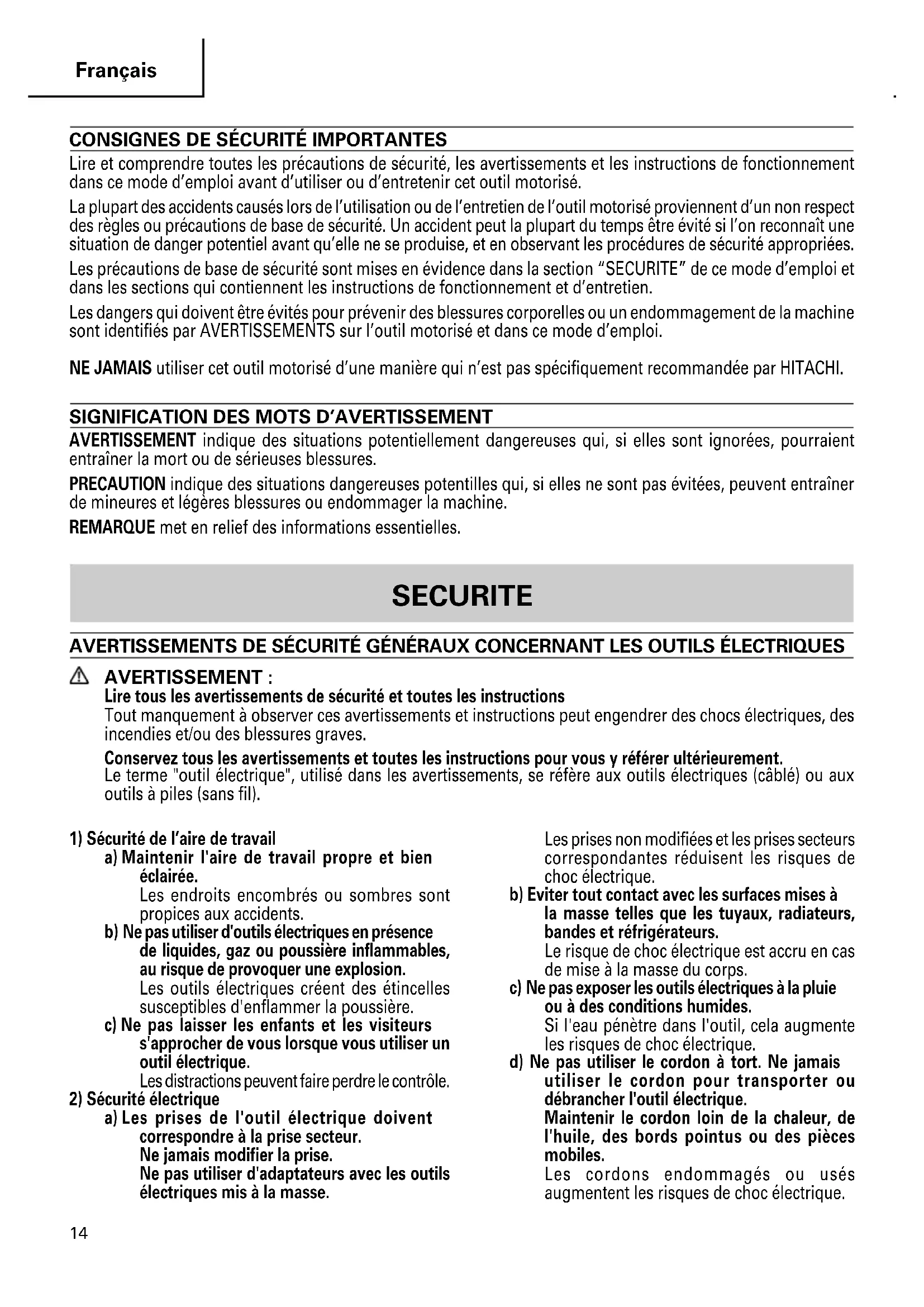 Lire et comprendre toutes les précautions de sécurité, les avertissements et les instructions de fonctionnement dans ce mode d’emploi avant d’utiliser ou d’entretenir cet outil motorisé. La plupart des accidents causés lors de l’utilisation ou de l’entretien de l’outil motorisé proviennent d’un non respect des règles ou précautions de base de sécurité. Un accident peut la plupart du temps être évité si l’on reconnaît une situation de danger potentiel avant qu’elle ne se produise, et en observant les procédures de sécurité appropriées. Les précautions de base de sécurité sont mises en évidence dans la section “SECURITE” de ce mode d’emploi et dans les sections qui contiennent les instructions de fonctionnement et d’entretien. Les dangers qui doivent être évités pour prévenir des blessures corporelles ou un endommagement de la machine sont identifiés par AVERTISSEMENTS sur l’outil motorisé et dans ce mode d’emploi. NE JAMAIS utiliser cet outil motorisé d’une manière qui n’est pas spécifiquement recommandée par HITACHI.
