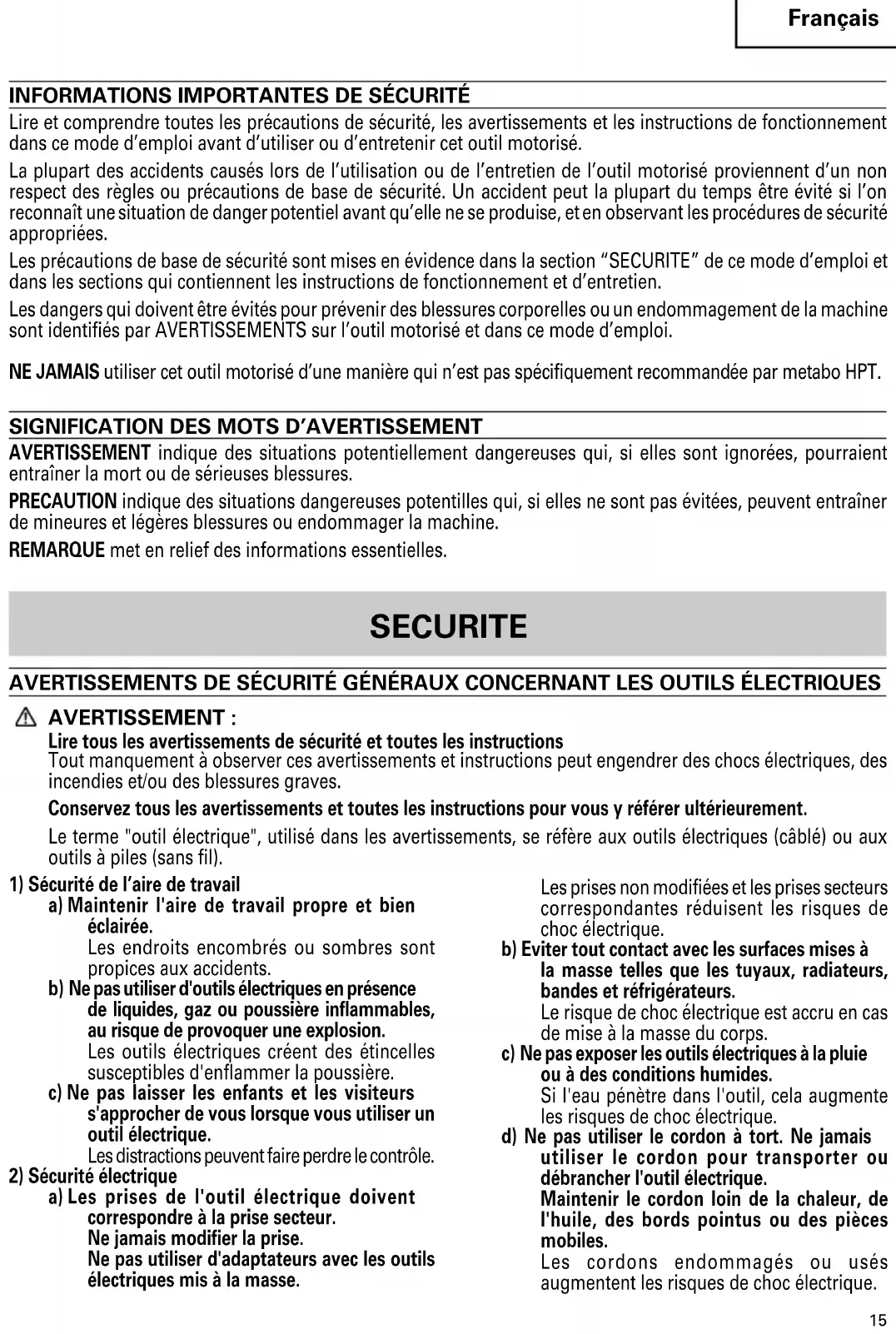 Lire et comprendre toutes les précautions de sécurité, les avertissements et les instructions de fonctionnement dans ce mode d’emploi avant d’utiliser ou d’entretenir cet outil motorisé. La plupart des accidents causés lors de l’utilisation ou de l’entretien de l’outil motorisé proviennent d’un non respect des règles ou précautions de base de sécurité. Un accident peut la plupart du temps être évité si l’on reconnaît une situation de danger potentiel avant qu’elle ne se produise, et en observant les procédures de sécurité appropriées. Les précautions de base de sécurité sont mises en évidence dans la section “SECURITE” de ce mode d’emploi et dans les sections qui contiennent les instructions de fonctionnement et d’entretien. Les dangers qui doivent être évités pour prévenir des blessures corporelles ou un endommagement de la machine sont identifiés par AVERTISSEMENTS sur l’outil motorisé et dans ce mode d’emploi. NE JAMAIS utiliser cet outil motorisé d’une manière qui n’est pas spécifiquement recommandée par metabo HPT.