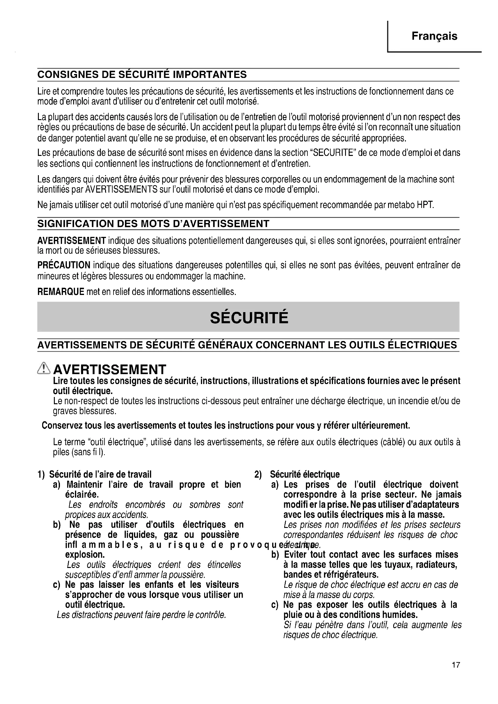 Lire et comprendre toutes les précautions de sécurité, les avertissements et les instructions de fonctionnement dans ce mode d’emploi avant d’utiliser ou d’entretenir cet outil motorisé. La plupart des accidents causés lors de l’utilisation ou de l’entretien de l’outil motorisé proviennent d’un non respect des règles ou précautions de base de sécurité. Un accident peut la plupart du temps être évité si l’on reconnaît une situation de danger potentiel avant qu’elle ne se produise, et en observant les procédures de sécurité appropriées. Les précautions de base de sécurité sont mises en évidence dans la section “SECURITE” de ce mode d’emploi et dans les sections qui contiennent les instructions de fonctionnement et d’entretien. Les dangers qui doivent être évités pour prévenir des blessures corporelles ou un endommagement de la machine sont identifi és par AVERTISSEMENTS sur l’outil motorisé et dans ce mode d’emploi. Ne jamais utiliser cet outil motorisé d’une manière qui n’est pas spécifi quement recommandée par metabo HPT.