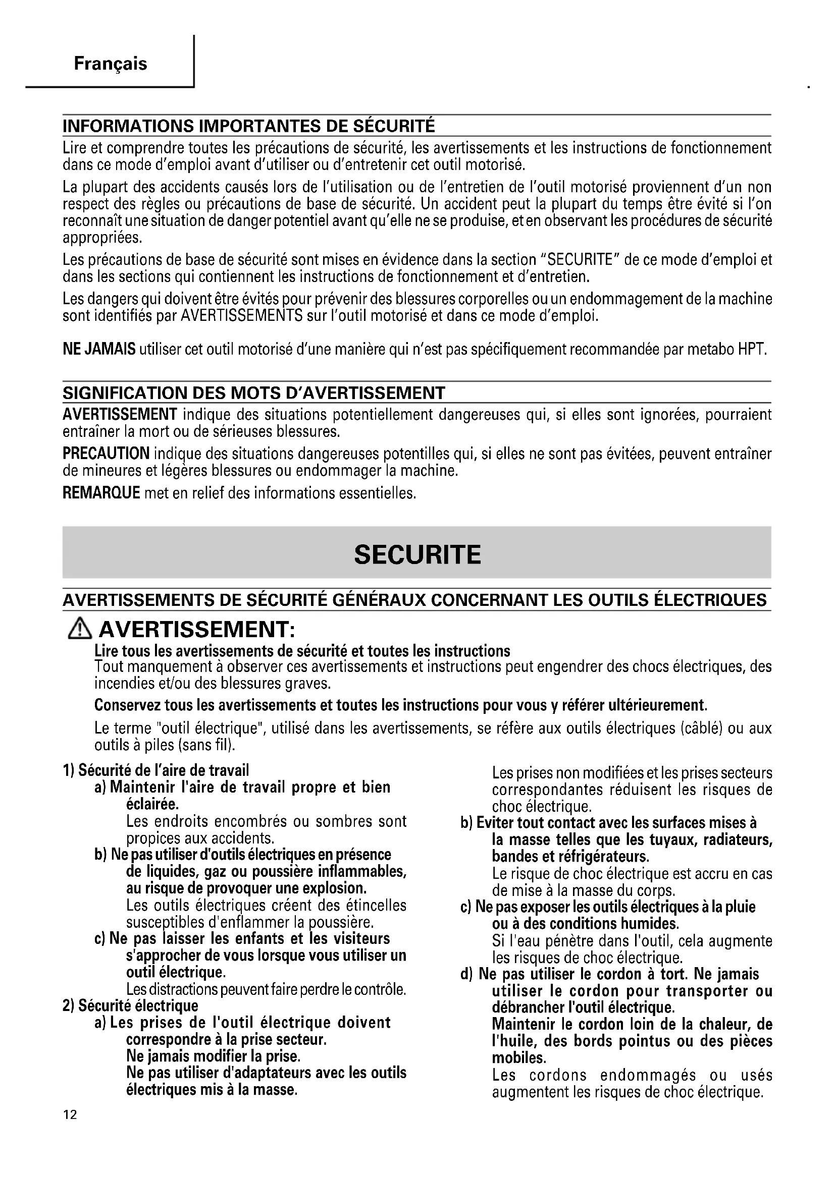 Lire et comprendre toutes les précautions de sécurité, les avertissements et les instructions de fonctionnement dans ce mode d’emploi avant d’utiliser ou d’entretenir cet outil motorisé. La plupart des accidents causés lors de l’utilisation ou de l’entretien de l’outil motorisé proviennent d’un non respect des règles ou précautions de base de sécurité. Un accident peut la plupart du temps être évité si l’on reconnaît une situation de danger potentiel avant qu’elle ne se produise, et en observant les procédures de sécurité appropriées. Les précautions de base de sécurité sont mises en évidence dans la section “SECURITE” de ce mode d’emploi et dans les sections qui contiennent les instructions de fonctionnement et d’entretien. Les dangers qui doivent être évités pour prévenir des blessures corporelles ou un endommagement de la machine sont identifiés par AVERTISSEMENTS sur l’outil motorisé et dans ce mode d’emploi. NE JAMAIS utiliser cet outil motorisé d’une manière qui n’est pas spécifiquement recommandée par metabo HPT.