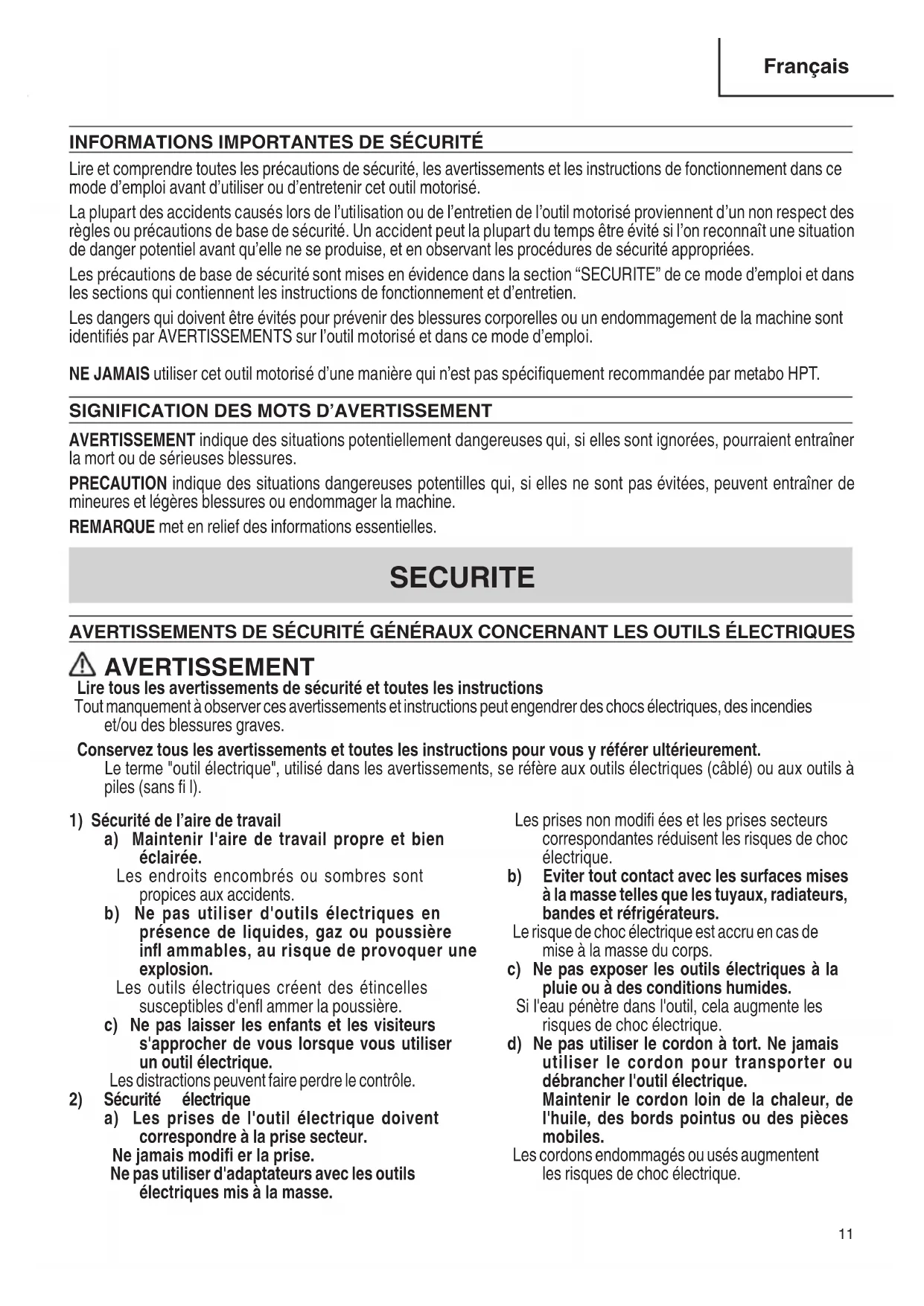 Lire et comprendre toutes les précautions de sécurité, les avertissements et les instructions de fonctionnement dans ce mode d’emploi avant d’utiliser ou d’entretenir cet outil motorisé. La plupart des accidents causés lors de l’utilisation ou de l’entretien de l’outil motorisé proviennent d’un non respect des règles ou précautions de base de sécurité. Un accident peut la plupart du temps être évité si l’on reconnaît une situation de danger potentiel avant qu’elle ne se produise, et en observant les procédures de sécurité appropriées. Les précautions de base de sécurité sont mises en évidence dans la section “SECURITE” de ce mode d’emploi et dans les sections qui contiennent les instructions de fonctionnement et d’entretien. Les dangers qui doivent être évités pour prévenir des blessures corporelles ou un endommagement de la machine sont identifi és par AVERTISSEMENTS sur l’outil motorisé et dans ce mode d’emploi. NE JAMAIS utiliser cet outil motorisé d’une manière qui n’est pas spécifi quement recommandée par metabo HPT.