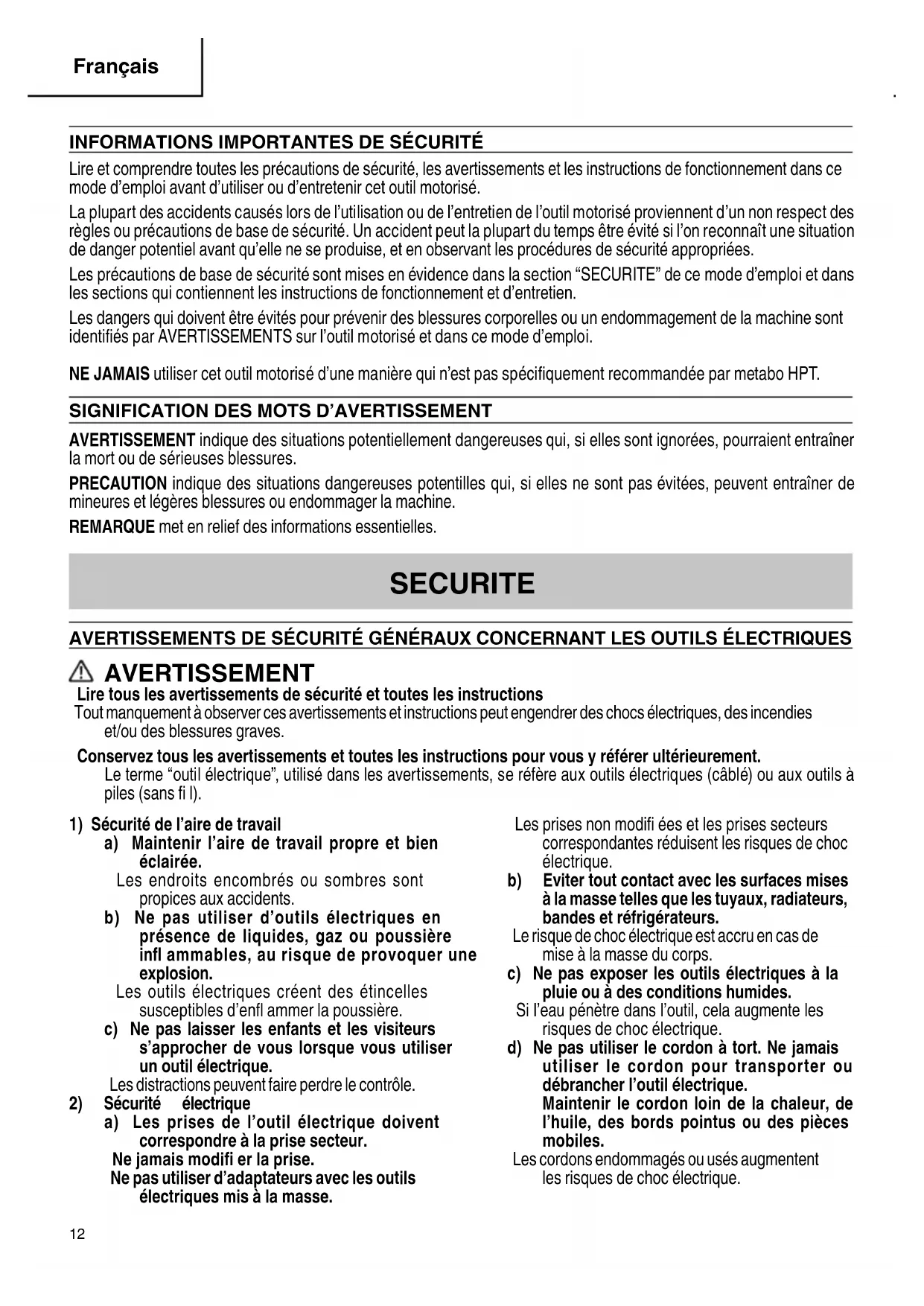 Lire et comprendre toutes les précautions de sécurité, les avertissements et les instructions de fonctionnement dans ce mode d’emploi avant d’utiliser ou d’entretenir cet outil motorisé. La plupart des accidents causés lors de l’utilisation ou de l’entretien de l’outil motorisé proviennent d’un non respect des règles ou précautions de base de sécurité. Un accident peut la plupart du temps être évité si l’on reconnaît une situation de danger potentiel avant qu’elle ne se produise, et en observant les procédures de sécurité appropriées. Les précautions de base de sécurité sont mises en évidence dans la section “SECURITE” de ce mode d’emploi et dans les sections qui contiennent les instructions de fonctionnement et d’entretien. Les dangers qui doivent être évités pour prévenir des blessures corporelles ou un endommagement de la machine sont identifi és par AVERTISSEMENTS sur l’outil motorisé et dans ce mode d’emploi. NE JAMAIS utiliser cet outil motorisé d’une manière qui n’est pas spécifi quement recommandée par metabo HPT.