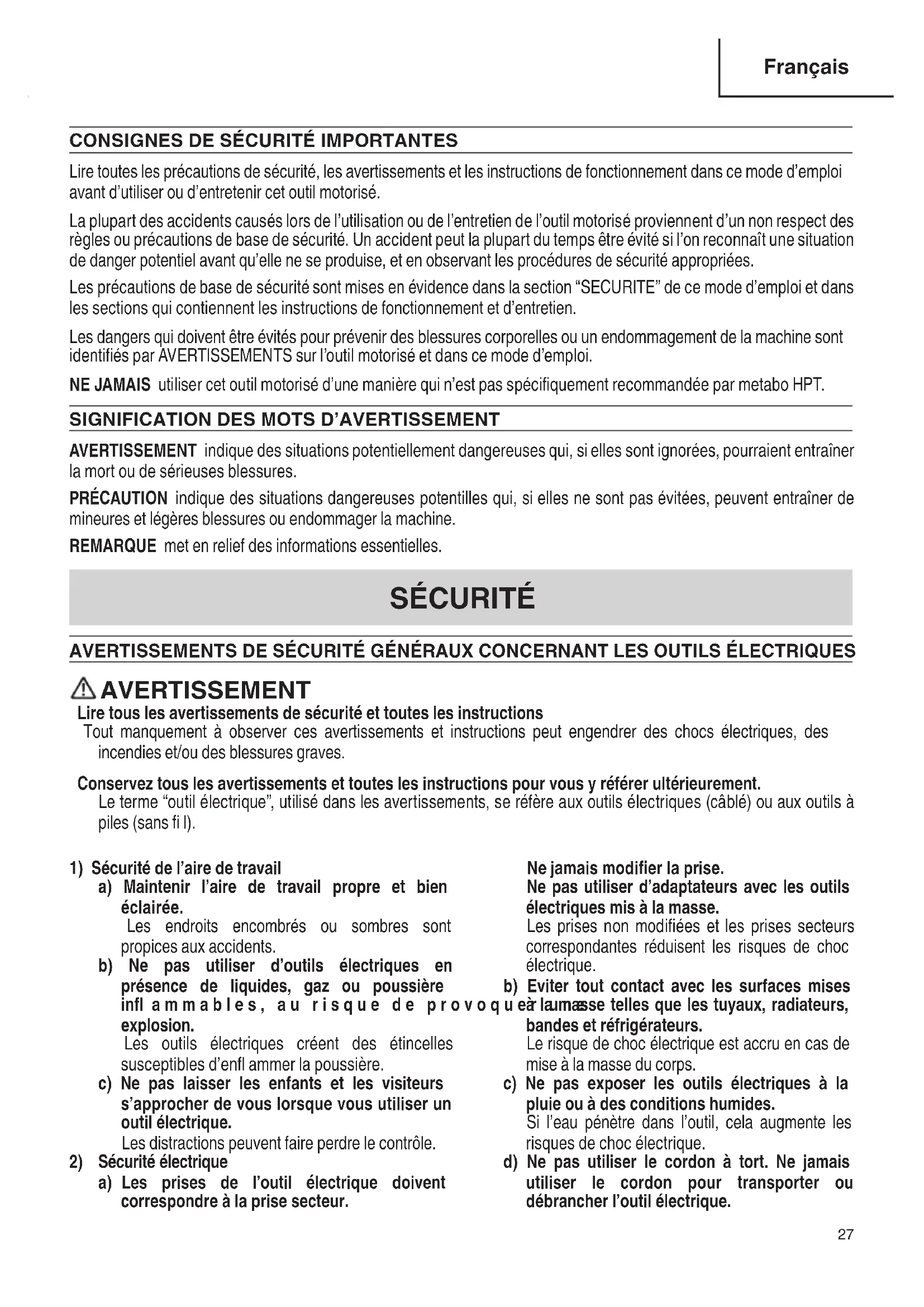 Lire toutes les précautions de sécurité, les avertissements et les instructions de fonctionnement dans ce mode d’emploi avant d’utiliser ou d’entretenir cet outil motorisé. La plupart des accidents causés lors de l’utilisation ou de l’entretien de l’outil motorisé proviennent d’un non respect des règles ou précautions de base de sécurité. Un accident peut la plupart du temps être évité si l’on reconnaît une situation de danger potentiel avant qu’elle ne se produise, et en observant les procédures de sécurité appropriées. Les précautions de base de sécurité sont mises en évidence dans la section “SECURITE” de ce mode d’emploi et dans les sections qui contiennent les instructions de fonctionnement et d’entretien. Les dangers qui doivent être évités pour prévenir des blessures corporelles ou un endommagement de la machine sont identifi és par AVERTISSEMENTS sur l’outil motorisé et dans ce mode d’emploi. NE JAMAIS utiliser cet outil motorisé d’une manière qui n’est pas spécifi quement recommandée par metabo HPT.