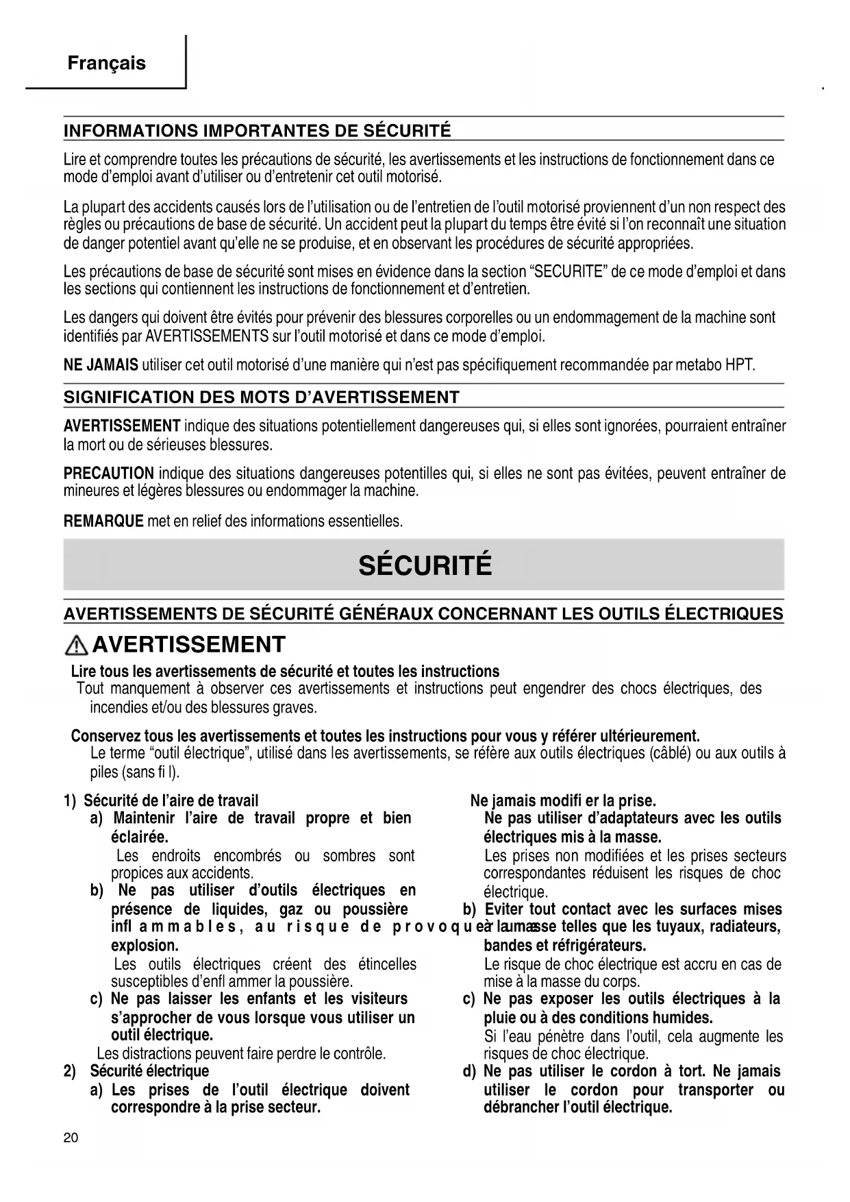 English 00BookDS18DFXmetabo.indb1900BookDS18DFXmetabo.indb19 2021/09/2815:33:372021/09/2815:33:37INFORMATIONS IMPORTANTES DE SÉCURITÉ Lire et comprendre toutes les précautions de sécurité, les avertissements et les instructions de fonctionnement dans ce mode d’emploi avant d’utiliser ou d’entretenir cet outil motorisé. La plupart des accidents causés lors de l’utilisation ou de l’entretien de l’outil motorisé proviennent d’un non respect des règles ou précautions de base de sécurité. Un accident peut la plupart du temps être évité si l’on reconnaît une situation de danger potentiel avant qu’elle ne se produise, et en observant les procédures de sécurité appropriées. Les précautions de base de sécurité sont mises en évidence dans la section “SECURITE” de ce mode d’emploi et dans les sections qui contiennent les instructions de fonctionnement et d’entretien. Les dangers qui doivent être évités pour prévenir des blessures corporelles ou un endommagement de la machine sont identifi és par AVERTISSEMENTS sur l’outil motorisé et dans ce mode d’emploi. NE JAMAIS utiliser cet outil motorisé d’une manière qui n’est pas spécifi quement recommandée par metabo HPT.