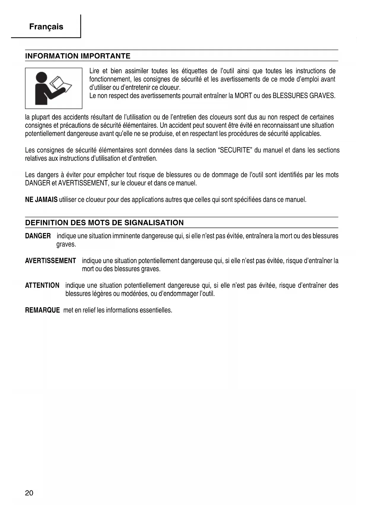 Seules les personnes qui ont lu et compris ce MANUEL doivent utiliser le cloueur.