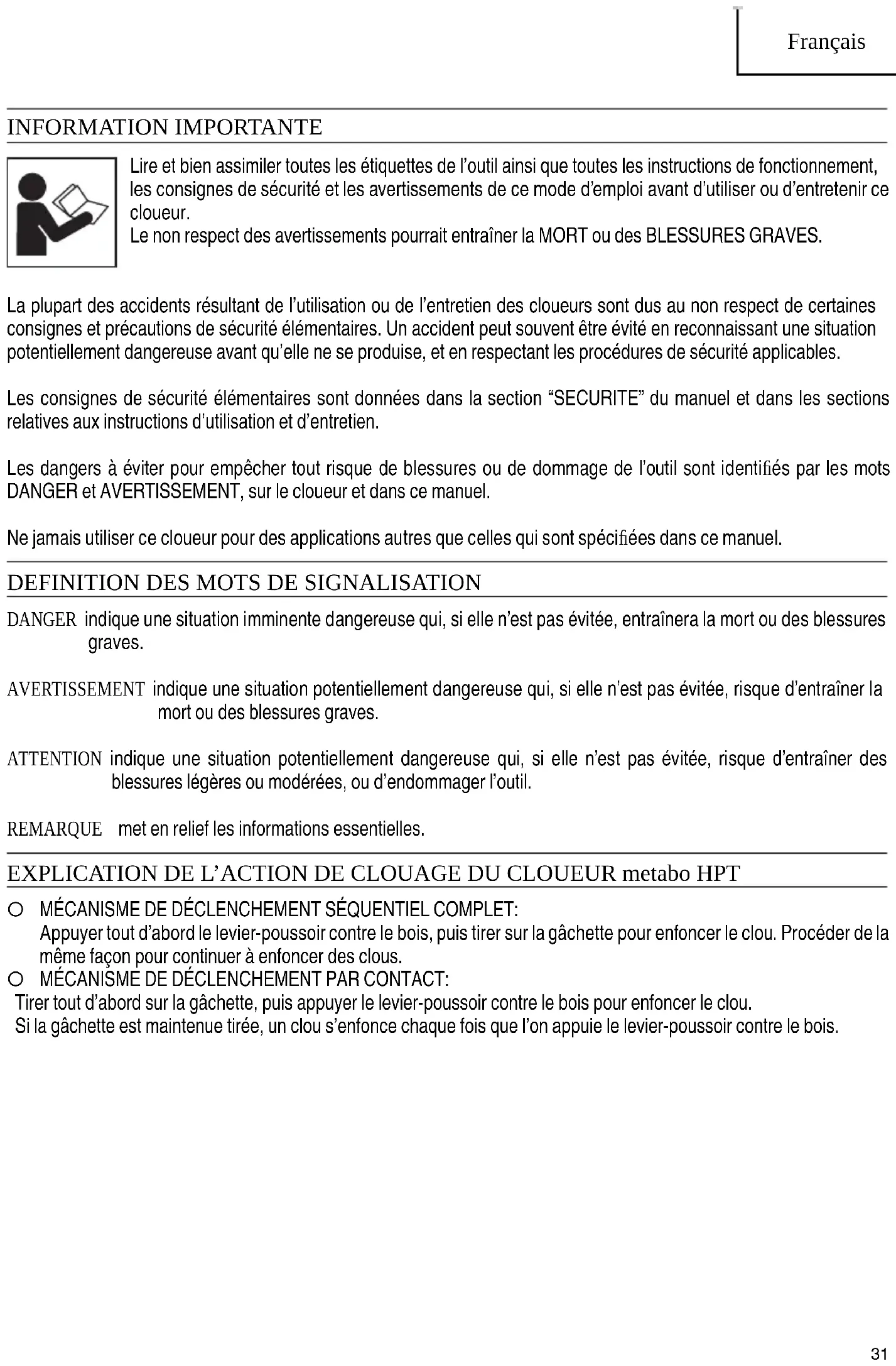 Nailer operates, but no nail is driven. Magazine is dirty. Blow and wipe clean the magazine. Check for a jam. Clear a jam (refer to page 27). Driver blade worn or damaged? Contact metabo HPT for inspection. Ribbon spring weakened or damaged? Replace ribbon spring. Nail feeder damaged? Replace nail feeder. Check for proper nails. Use only recommended nails. Weak drive. Slow to cycle. Check position of nailing depth adjustment adjuster. Readjust according to page 26. Driver blade worn? Contact metabo HPT for inspection. Compressed air pressure has become low. Contact metabo HPT for inspection. Damaged internal electronics. Contact metabo HPT for inspection. Drives too deep. Check position of nailing depth adjustment adjuster. Readjust according to page 26. Skipping nails. Intermittent feed. Check for proper nails. Use only recommended nails. Nail feeder damaged? Replace nail feeder. Ribbon spring weakened or damaged? Replace ribbon spring. Driver blade worn or damaged? Contact metabo HPT for inspection. Nails jam. Driven nail is bent. Check for proper nails. Use only recommended nails. Driver blade worn or damaged? Contact metabo HPT for inspection. 000BookNR1890DC(S)metabo.indb30000BookNR1890DC(S)metabo.indb30 2022/08/1818:32:542022/08/1818:32:5431 Français INFORMATION IMPORTANTE Lire et bien assimiler toutes les étiquettes de l’outil ainsi que toutes les instructions de fonctionnement, les consignes de sécurité et les avertissements de ce mode d’emploi avant d’utiliser ou d’entretenir ce cloueur. Le non respect des avertissements pourrait entraîner la MORT ou des BLESSURES GRAVES. La plupart des accidents résultant de l’utilisation ou de l’entretien des cloueurs sont dus au non respect de certaines consignes et précautions de sécurité élémentaires. Un accident peut souvent être évité en reconnaissant une situation potentiellement dangereuse avant qu’elle ne se produise, et en respectant les procédures de sécurité applicables. Les consignes de sécurité élémentaires sont données dans la section “SECURITE” du manuel et dans les sections relatives aux instructions d’utilisation et d’entretien. Les dangers à éviter pour empêcher tout risque de blessures ou de dommage de l’outil sont identifi és par les mots DANGER et AVERTISSEMENT, sur le cloueur et dans ce manuel. Ne jamais utiliser ce cloueur pour des applications autres que celles qui sont spécifi ées dans ce manuel.
