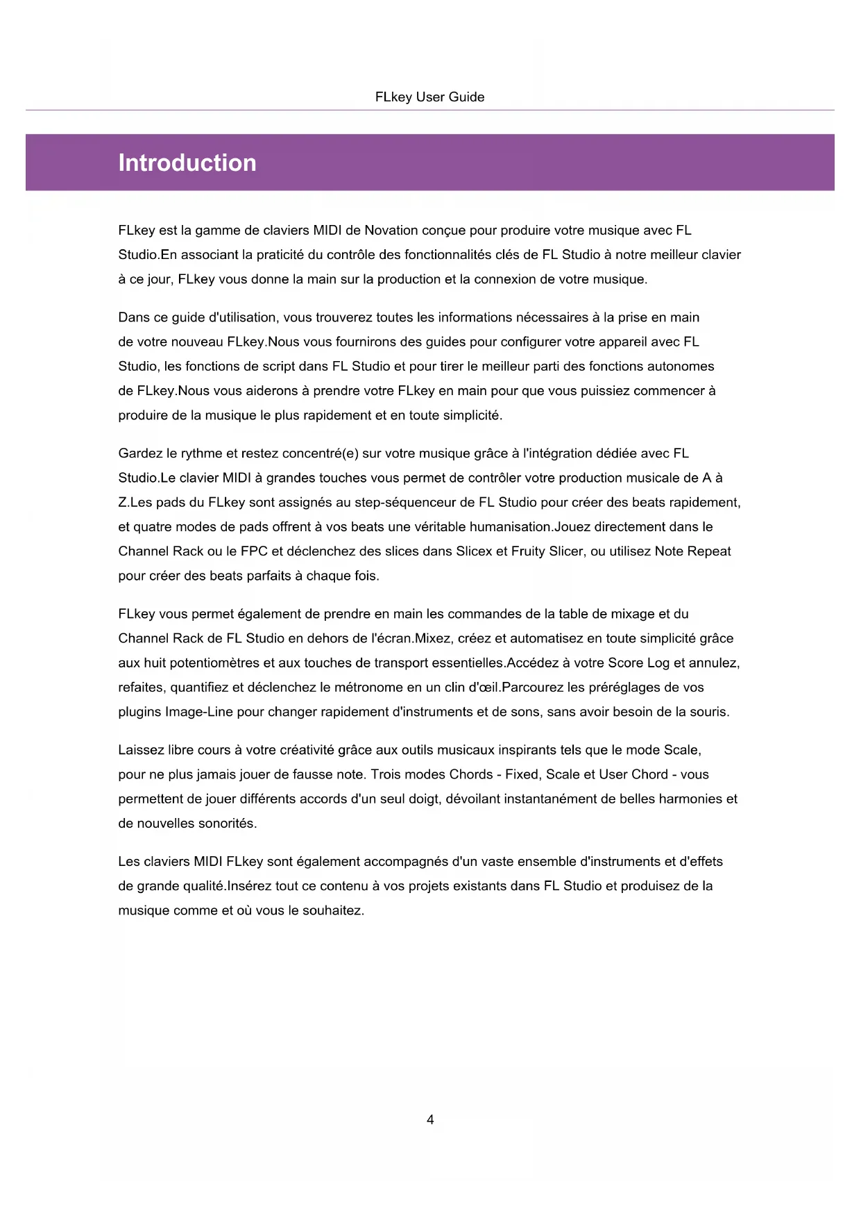 - Copyright et informations juridiques FLkey User Guide 3Introduction FLkey est la gamme de claviers MIDI de Novation conçue pour produire votre musique avec FL Studio.En associant la praticité du contrôle des fonctionnalités clés de FL Studio à notre meilleur clavier à ce jour, FLkey vous donne la main sur la production et la connexion de votre musique. Dans ce guide d'utilisation, vous trouverez toutes les informations nécessaires à la prise en main de votre nouveau FLkey.Nous vous fournirons des guides pour configurer votre appareil avec FL Studio, les fonctions de script dans FL Studio et pour tirer le meilleur parti des fonctions autonomes de FLkey.Nous vous aiderons à prendre votre FLkey en main pour que vous puissiez commencer à produire de la musique le plus rapidement et en toute simplicité. Gardez le rythme et restez concentré(e) sur votre musique grâce à l'intégration dédiée avec FL Studio.Le clavier MIDI à grandes touches vous permet de contrôler votre production musicale de A à Z.Les pads du FLkey sont assignés au step-séquenceur de FL Studio pour créer des beats rapidement, et quatre modes de pads offrent à vos beats une véritable humanisation.Jouez directement dans le Channel Rack ou le FPC et déclenchez des slices dans Slicex et Fruity Slicer, ou utilisez Note Repeat pour créer des beats parfaits à chaque fois. FLkey vous permet également de prendre en main les commandes de la table de mixage et du Channel Rack de FL Studio en dehors de l'écran.Mixez, créez et automatisez en toute simplicité grâce aux huit potentiomètres et aux touches de transport essentielles.Accédez à votre Score Log et annulez, refaites, quantifiez et déclenchez le métronome en un clin d'œil.Parcourez les préréglages de vos plugins Image-Line pour changer rapidement d'instruments et de sons, sans avoir besoin de la souris. Laissez libre cours à votre créativité grâce aux outils musicaux inspirants tels que le mode Scale, pour ne plus jamais jouer de fausse note. Trois modes Chords - Fixed, Scale et User Chord - vous permettent de jouer différents accords d'un seul doigt, dévoilant instantanément de belles harmonies et de nouvelles sonorités. Les claviers MIDI FLkey sont également accompagnés d'un vaste ensemble d'instruments et d'effets de grande qualité.Insérez tout ce contenu à vos projets existants dans FL Studio et produisez de la musique comme et où vous le souhaitez. FLkey User Guide 4Caractéristiques Principales p. 50