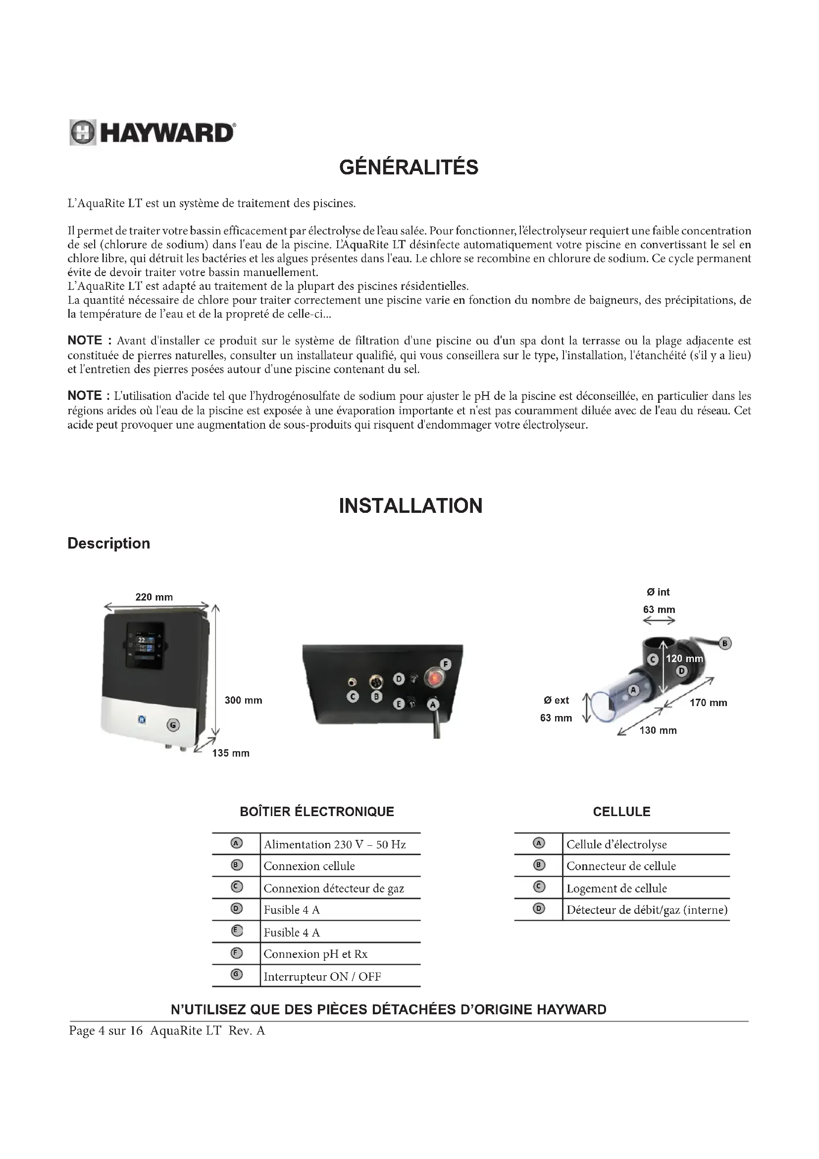 L’AquaRite LT est un système de traitement des piscines. Il permet de traiter votre bassin efficacement par électrolyse de l’eau salée. Pour fonctionner, l’électrolyseur requiert une faible concentration de sel (chlorure de sodium) dans l'eau de la piscine. L’AquaRite LT désinfecte automatiquement votre piscine en convertissant le sel en chlore libre, qui détruit les bactéries et les algues présentes dans l'eau. Le chlore se recombine en chlorure de sodium. Ce cycle permanent évite de devoir traiter votre bassin manuellement. L’AquaRite LT est adapté au traitement de la plupart des piscines résidentielles. La quantité nécessaire de chlore pour traiter correctement une piscine varie en fonction du nombre de baigneurs, des précipitations, de la température de l’eau et de la propreté de celle-ci... NOTE : Avant d'installer ce produit sur le système de filtration d'une piscine ou d'un spa dont la terrasse ou la plage adjacente est constituée de pierres naturelles, consulter un installateur qualifié, qui vous conseillera sur le type, l'installation, l'étanchéité (s'il y a lieu) et l'entretien des pierres posées autour d'une piscine contenant du sel. NOTE : L'utilisation d'acide tel que l’hydrogénosulfate de sodium pour ajuster le pH de la piscine est déconseillée, en particulier dans les régions arides où l'eau de la piscine est exposée à une évaporation importante et n'est pas couramment diluée avec de l'eau du réseau. Cet acide peut provoquer une augmentation de sous-produits qui risquent d'endommager votre électrolyseur. INSTALLATION Description 220 mm 300 mm Ø ext 63 mm Ø int 63 mm 120 mm 135 mm 170 mm 130 mm