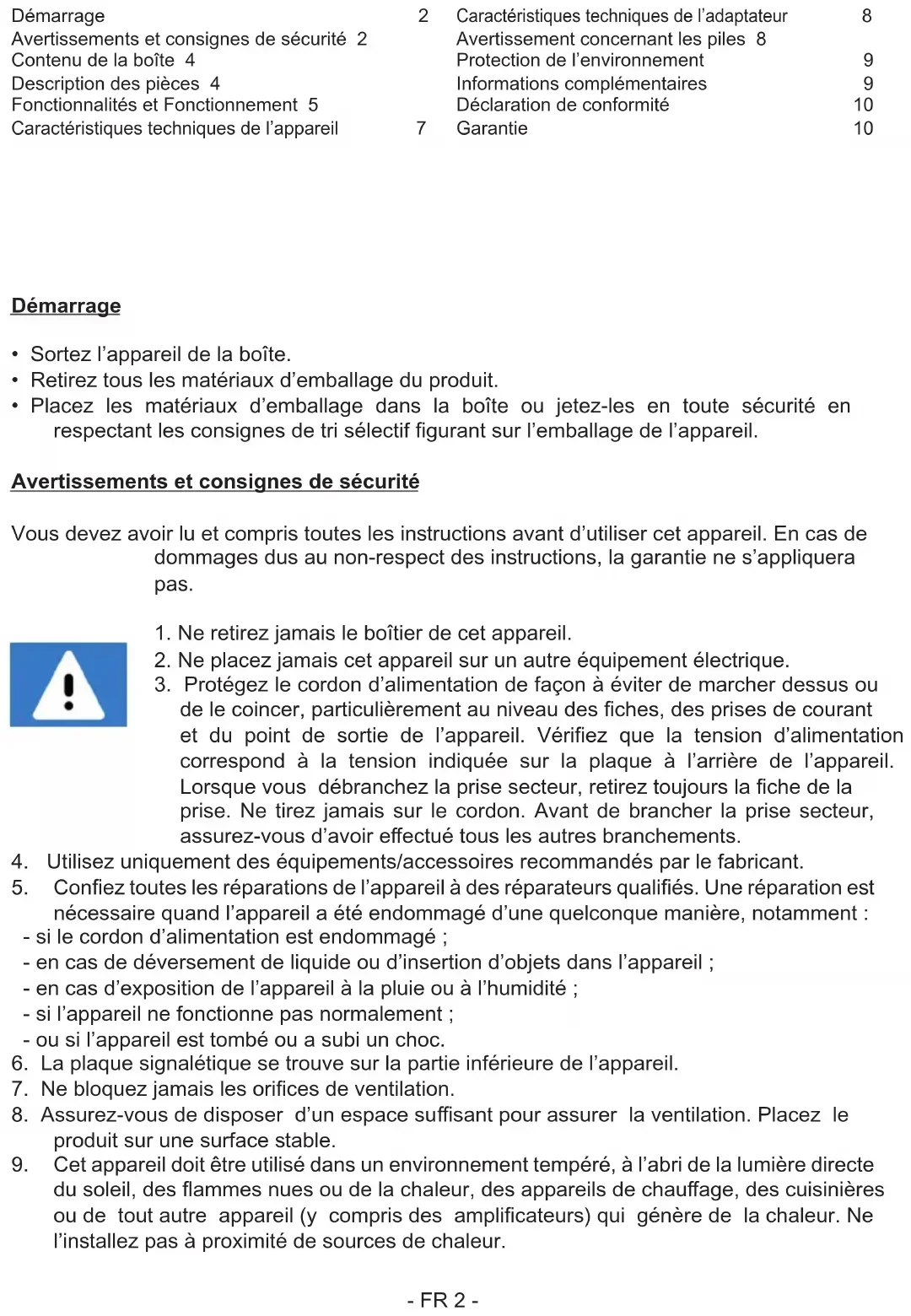 du soleil, des ammes nues ou de la chaleur, des appareils de chauage, des cuisinières ou de tout autre appareil (y compris des amplicateurs) qui génère de la chaleur. Ne l’inallez pas à proximité de sources de chaleur. Démarrage 2 Avertissements et consignes de sécurité 2 Contenu de la boîte 4 Description des pièces 4 Fonctionnalités et Fonctionnement 5 Caractéristiques techniques de l’appareil