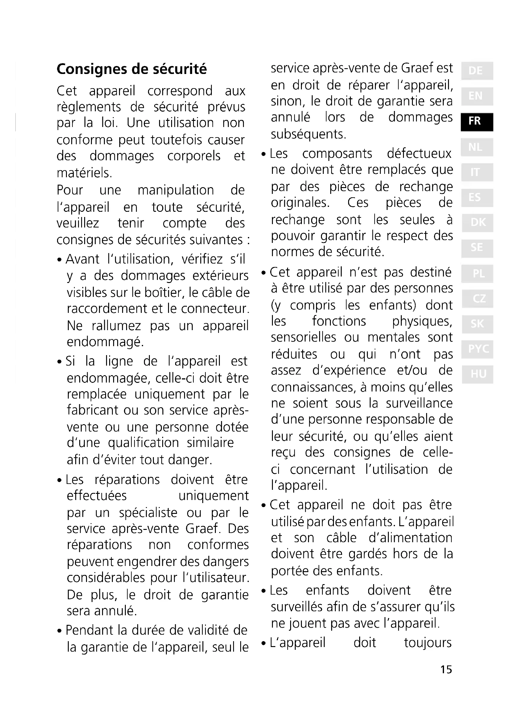 - Pendant la durée de validité de la garantie de l‘appareil, seul le service après-vente de Graef est en droit de réparer l‘appareil, sinon, le droit de garantie sera annulé lors de dommages subséquents.