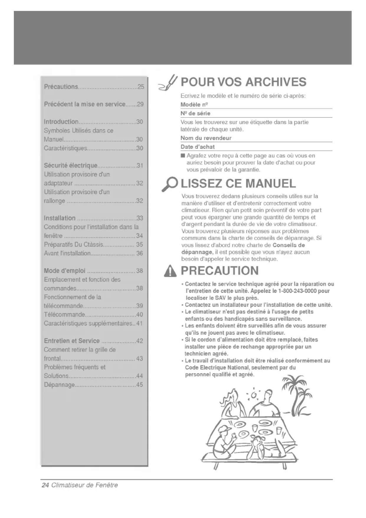 MANUEL PRECAUTION Manuel del'utilisateurClimatiseur Type Fenetre TABLE DES MATIERES Vous trouverez dedans plusieurs conseils utiles sur