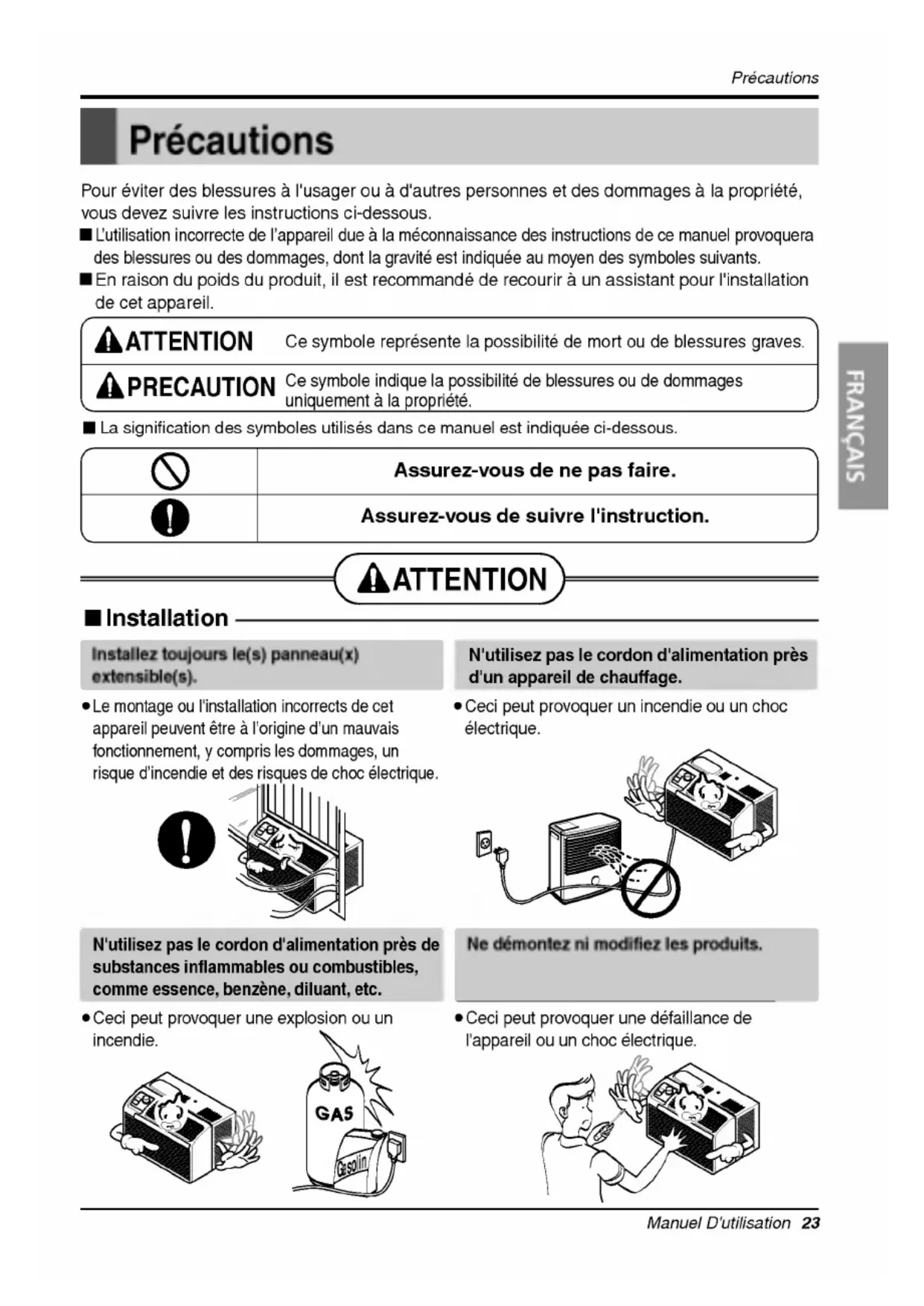 choc electrique. Assurez-vousdenepasfaire.Assurez-vousdesuivrel'instruction. FRANCAIS24ClimatiseurdeFenetrePrecautions