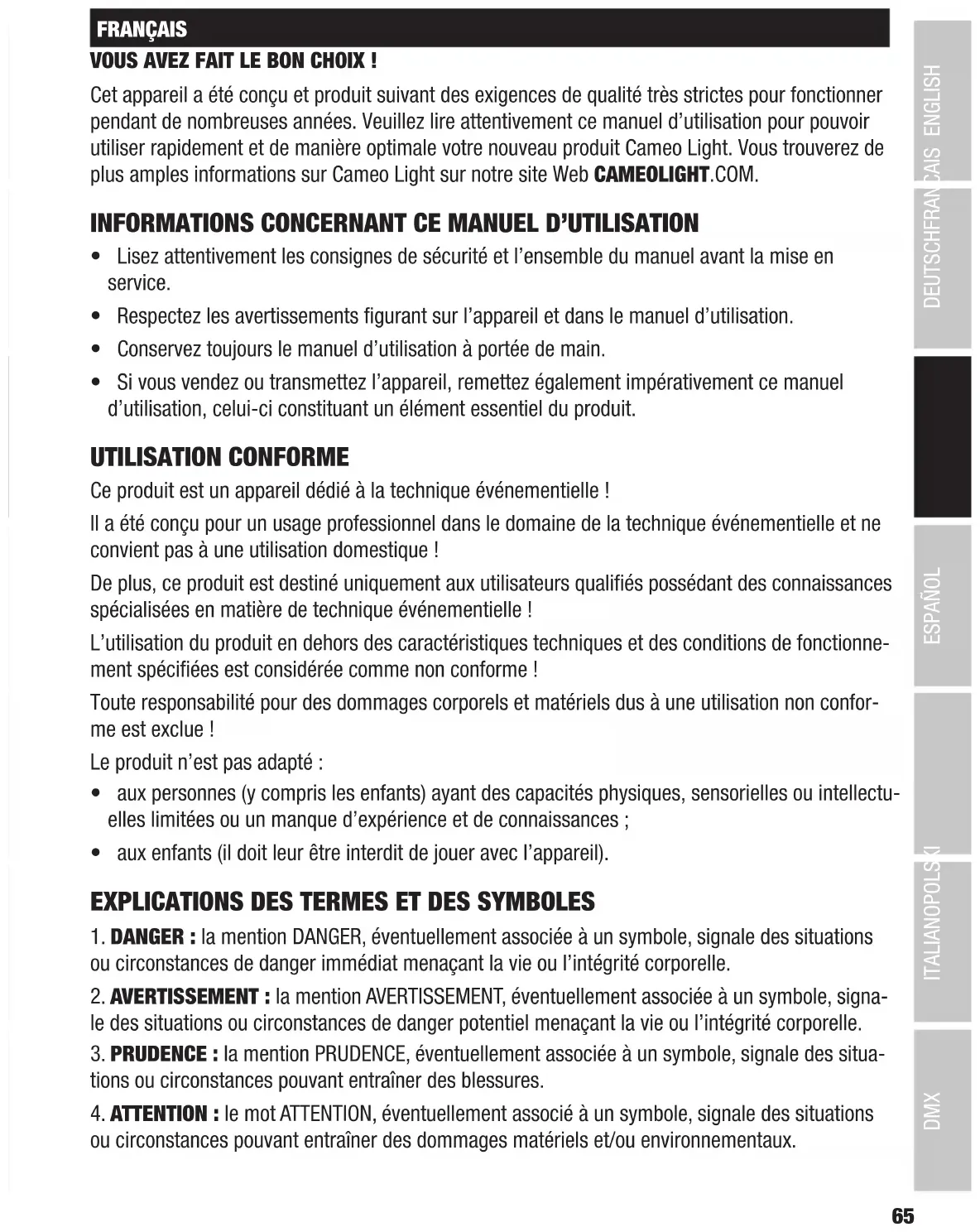 ou circonstances pouvant entraîner des dommages matériels et/ou environnementaux.66 DMX ITALIANO POLSKI ESPAÑOL FRANCAIS DEUTSCHENGLISH Ce symbole indique un danger susceptible de provoquer une décharge électrique. Ce symbole indique une zone ou une situation dangereuse. Ce symbole indique des dangers liés à des surfaces chaudes. Ce symbole signale des dangers liés à des sources lumineuses intenses. Ce symbole indique que l’appareil ne contient aucune pièce remplaçable par l’utilisateur. Ce symbole indique des informations complémentaires sur l’utilisation du produit.