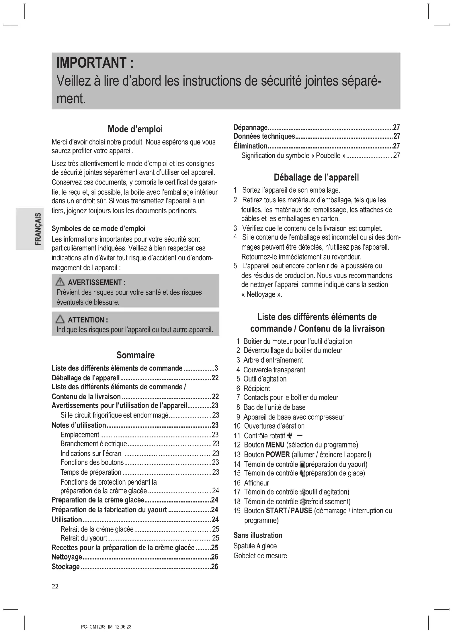 des résidus de production. Nous vous recommandons de nettoyer l’appareil comme indiqué dans la section « Nettoyage ». Liste des différents éléments de commande / Contenu de la livraison 1 Boîtier du moteur pour l’outil d’agitation 2 Déverrouillage du boîtier du moteur 3 Arbre d’entraînement 4 Couvercle transparent 5 Outil d’agitation 6 Récipient 7 Contacts pour le boîtier du moteur 8 Bac de l’unité de base 9 Appareil de base avec compresseur 10 Ouvertures d’aération 11 Contrôle rotatif / 12 Bouton MENU (sélection du programme) 13 Bouton POWER (allumer / éteindre l’appareil) 14 Témoin de contrôle (préparation du yaourt) 15 Témoin de contrôle (préparation de glace) 16 Afcheur 17 Témoin de contrôle (outil d’agitation) 18 Témoin de contrôle (refroidissement) 19 Bouton START / PAUSE (démarrage / interruption du programme) Sans illustration Spatule à glace Gobelet de mesurePC-ICM1268_IM 12.06.23