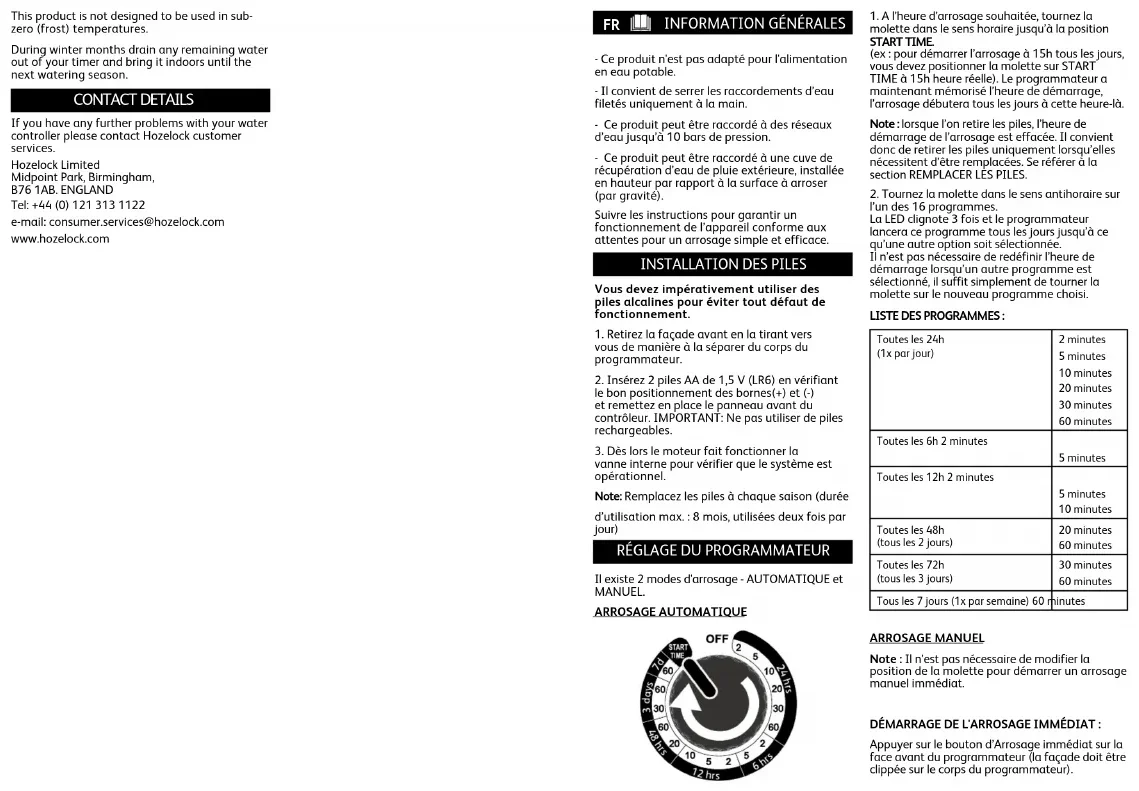 Température de l’eau max. 30°C Ce produit n’est pas conçu pour une utilisation à une température extérieure inférieure à 0°C. Durant ces périodes, il est fortement conseillé de vider le programmateur de son eau résiduelle et de stocker à l’intérieur jusqu’à la prochaine saison d’arrosage CONTACT En cas de problème avec votre programmateur d'arrosage, contactez le Service Client Hozelock Hozelock Limited Midpoint Park, Birmingham,