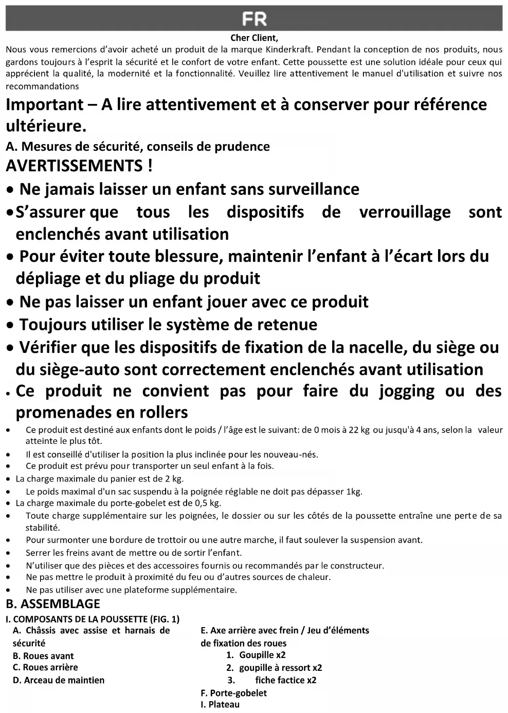 Nous vous remercions d’avoir acheté un produit de la marque Kinderkraft. Pendant la conception de nos produits, nous gardons toujours à l’esprit la sécurité et le confort de votre enfant. Cette poussette est une solution idéale pour ceux qui apprécient la qualité, la modernité et la fonctionnalité. Veuillez lire attentivement le manuel d'utilisation et suivre nos recommandations Important – A lire attentivement et à conserver pour référence ultérieure. A. Mesures de sécurité, conseils de prudence AVERTISSEMENTS !