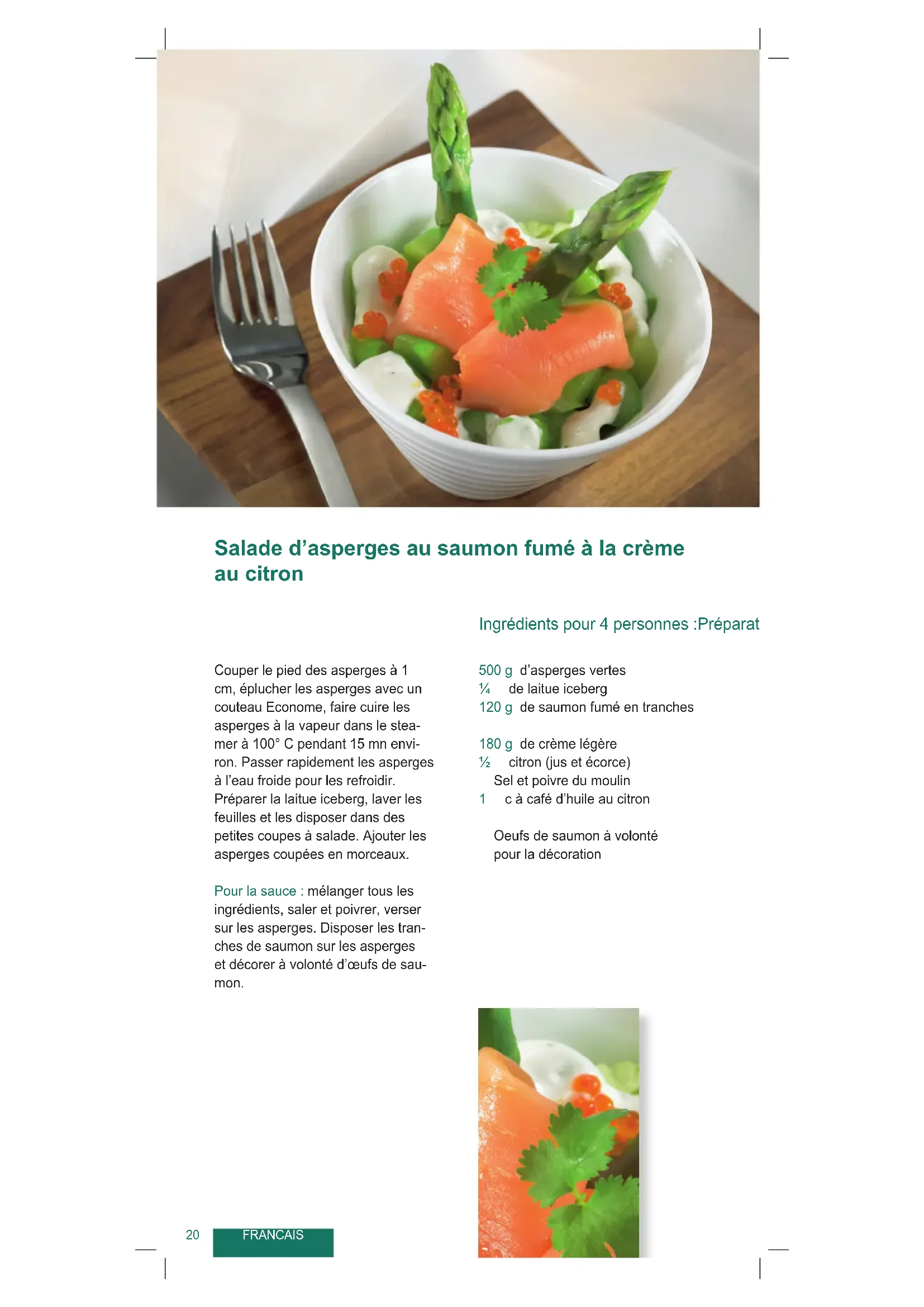 Salade d’asperges au saumon fumé à la crème au citron 500 g d’asperges vertes ¼ de laitue iceberg 120 g de saumon fumé en tranches 180 g de crème légère ½ citron (jus et écorce) Sel et poivre du moulin 1 c à café d’huile au citron Oeufs de saumon à volonté pour la décoration Couper le pied des asperges à 1 cm, éplucher les asperges avec un couteau Econome, faire cuire les asperges à la vapeur dans le stea- mer à 100° C pendant 15 mn envi- ron. Passer rapidement les asperges à l’eau froide pour les refroidir. Préparer la laitue iceberg, laver les feuilles et les disposer dans des petites coupes à salade. Ajouter les asperges coupées en morceaux. Pour la sauce : mélanger tous les ingrédients, saler et poivrer, verser sur les asperges. Disposer les tran- ches de saumon sur les asperges et décorer à volonté d’œufs de sau- mon. Ingrédients pour 4 personnes :Préparation :21 Terrine de chanterelles jaunes au pesto à l’huile aux essences de citron 100 g de pain de mie en tranches 1 dl de lait 1½ dl de crème 2 œufs 400 g de chanterelles jaunes 30 g de beurre ½ oignon 3 gousses d’ail 1 c à soupe de persil haché Sel et poivre du moulin 4 c à soupe d’huile de citron 1 pointe de sambal olek (purée de piments) ½ Ecorce d’un demi-citron ½ c à café de jus de citron Thym citronné pour la décoration Enlever la croûte du pain de mie et découper en petits dés. Mélanger le lait, la crème et les œufs et incorpo- rer les dés de pain de mie. Laver les chanterelles. Faire chauffer le beurre dans une poêle, faire revenir dans la poêle les oignons et les gousses d’ail finement hachés. Ajouter les chanterelles et laisser cuire jusqu’à ce qu’elles aient rendu toute leur eau. Hacher grossièrement les cham- pignons avec un grand couteau à légumes et ajouter au pain de mie et au persil. Mélanger rapidement la préparation, assaisonner de sel et de poivre. Verser dans une terrine tapissée de film étirable alimentaire, recouvrir la terrine de film étirable et faire pocher dans le steamer à 85°C pendant 35 mn. Pour le pesto à l’huile aux essences de citron : Mélanger l’huile aux essences de citron, la purée de piments, les zestes et le jus de citron et assai- sonner de sel et de poivre. Servir tiède. Ingrédients pour 4 personnes :Préparation : FRANCAISFRANCAIS