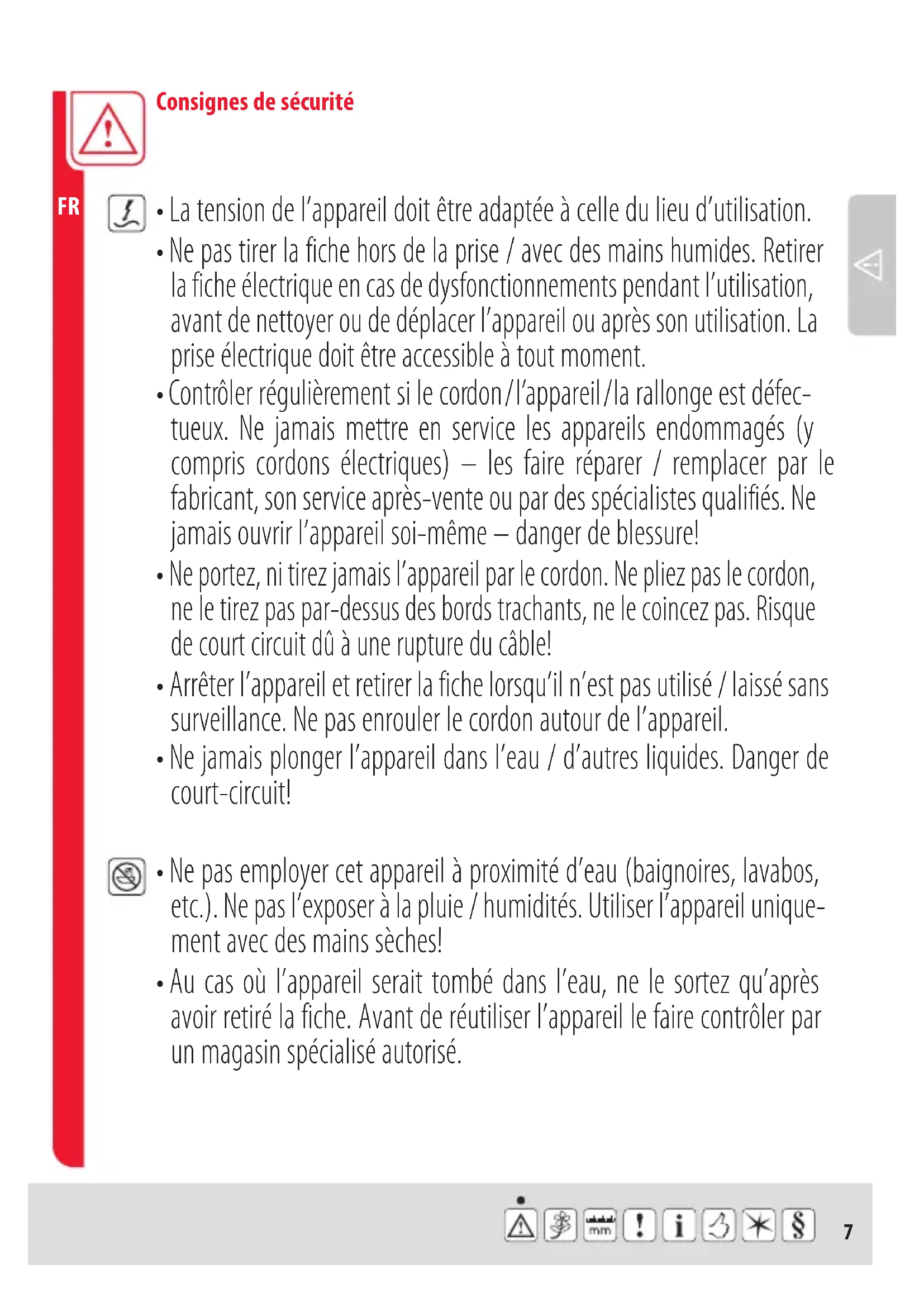 - Ne pas employer cet appareil à proximité d’eau (baignoires, lavabos, etc.). Ne pas l’exposer à la pluie / humidités. Utiliser l’appareil unique- ment avec des mains sèches!8 Consignes de sécurité