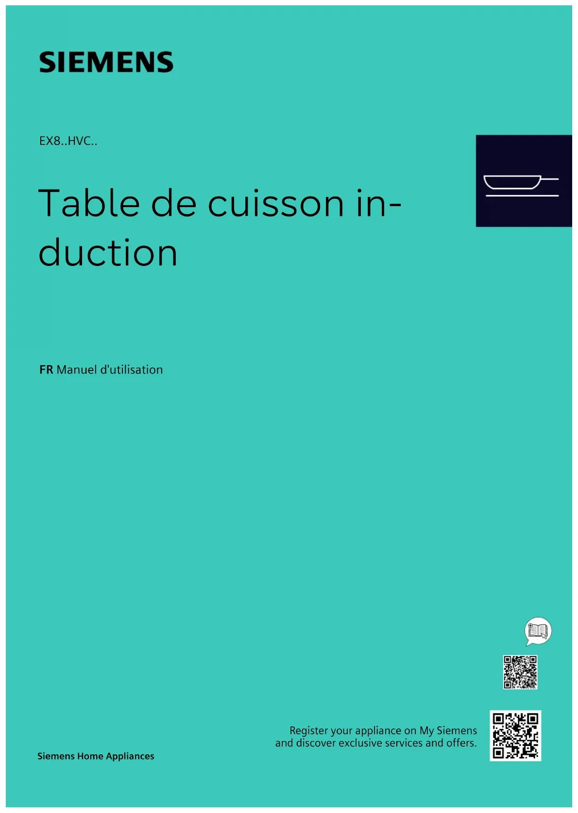 - Table de cuisson in- duction FR Manuel d'utilisation Siemens Home Appliances Register your appliance on My Siemens and discover exclusive services and offers.fr Table des matières Vous pouvez trouver d'autres informations et explications en ligne. Scannez le code QR sur la page de titre. Table des matièresTable des matières 1 Sécurité p. 2