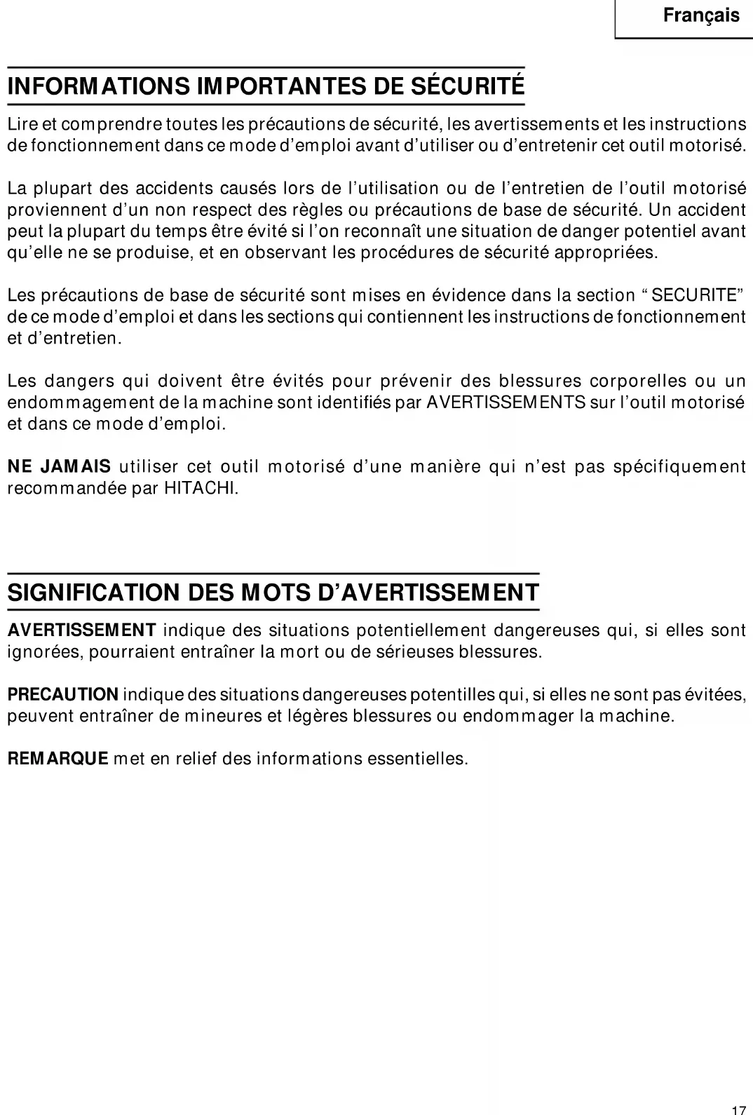 Lire et comprendre toutes les précautions de sécurité, les avertissements et les instructions de fonctionnement dans ce mode d’emploi avant d’utiliser ou d’entretenir cet outil motorisé. La plupart des accidents causés lors de l’utilisation ou de l’entretien de l’outil motorisé proviennent d’un non respect des règles ou précautions de base de sécurité. Un accident peut la plupart du temps être évité si l’on reconnaît une situation de danger potentiel avant qu’elle ne se produise, et en observant les procédures de sécurité appropriées. Les précautions de base de sécurité sont mises en évidence dans la section “SECURITE” de ce mode d’emploi et dans les sections qui contiennent les instructions de fonctionnement et d’entretien. Les dangers qui doivent être évités pour prévenir des blessures corporelles ou un endommagement de la machine sont identifiés par AVERTISSEMENTS sur l’outil motorisé et dans ce mode d’emploi. NE JAMAIS utiliser cet outil motorisé d’une manière qui n’est pas spécifiquement recommandée par HITACHI.