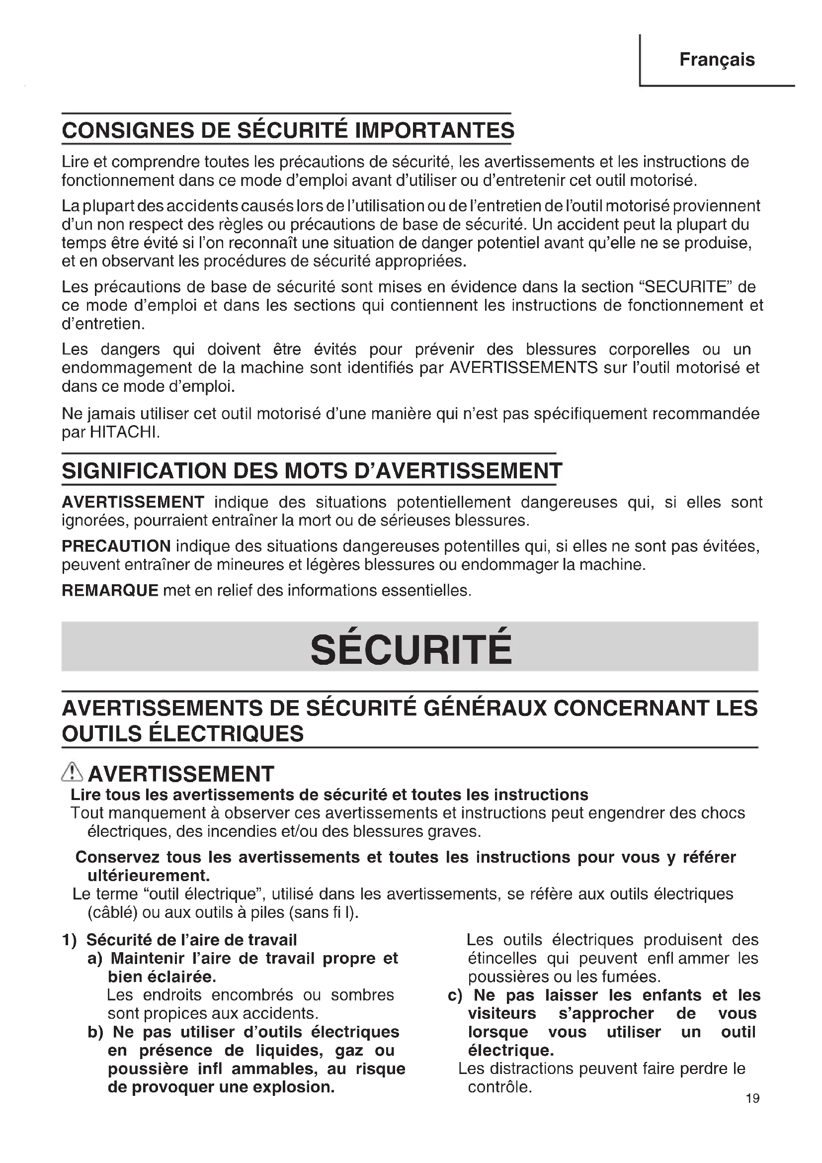 Lire et comprendre toutes les précautions de sécurité, les avertissements et les instructions de fonctionnement dans ce mode d’emploi avant d’utiliser ou d’entretenir cet outil motorisé. La plupart des accidents causés lors de l’utilisation ou de l’entretien de l’outil motorisé proviennent d’un non respect des règles ou précautions de base de sécurité. Un accident peut la plupart du temps être évité si l’on reconnaît une situation de danger potentiel avant qu’elle ne se produise, et en observant les procédures de sécurité appropriées. Les précautions de base de sécurité sont mises en évidence dans la section “SECURITE” de ce mode d’emploi et dans les sections qui contiennent les instructions de fonctionnement et d’entretien. Les dangers qui doivent être évités pour prévenir des blessures corporelles ou un endommagement de la machine sont identifi és par AVERTISSEMENTS sur l’outil motorisé et dans ce mode d’emploi. Ne jamais utiliser cet outil motorisé d’une manière qui n’est pas spécifi quement recommandée par HITACHI.