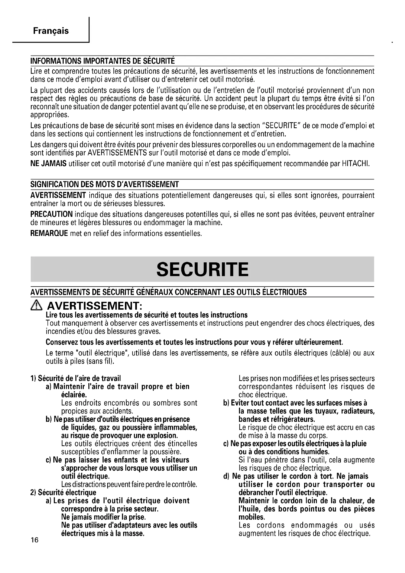 Lire et comprendre toutes les précautions de sécurité, les avertissements et les instructions de fonctionnement dans ce mode d’emploi avant d’utiliser ou d’entretenir cet outil motorisé. La plupart des accidents causés lors de l’utilisation ou de l’entretien de l’outil motorisé proviennent d’un non respect des règles ou précautions de base de sécurité. Un accident peut la plupart du temps être évité si l’on reconnaît une situation de danger potentiel avant qu’elle ne se produise, et en observant les procédures de sécurité appropriées. Les précautions de base de sécurité sont mises en évidence dans la section “SECURITE” de ce mode d’emploi et dans les sections qui contiennent les instructions de fonctionnement et d’entretien. Les dangers qui doivent être évités pour prévenir des blessures corporelles ou un endommagement de la machine sont identifiés par AVERTISSEMENTS sur l’outil motorisé et dans ce mode d’emploi. NE JAMAIS utiliser cet outil motorisé d’une manière qui n’est pas spécifiquement recommandée par HITACHI.