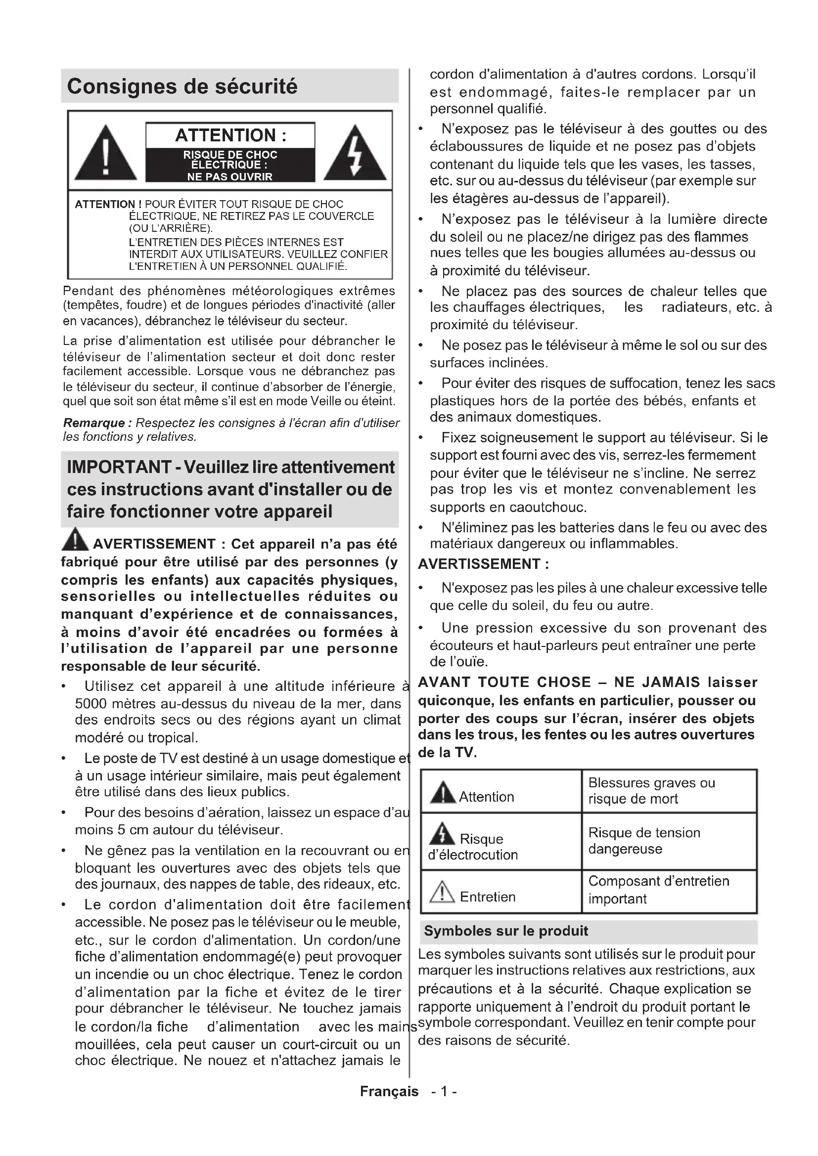 N'exposez pas les piles à une chaleur excessive telle que celle du soleil, du feu ou autre. Une pression excessive du son provenant des écouteurs et haut-parleurs peut entraîner une perte de l’ouïe. AVANT TOUTE CHOSE – NE JAMAIS laisser quiconque, les enfants en particulier, pousser ou porter des coups sur l’écran, insérer des objets dans les trous, les fentes ou les autres ouvertures de la TV. Attention Blessures graves ou risque de mort Risque d’électrocution Risque de tension dangereuse Entretien Composant d’entretien important Symboles sur le produit Les symboles suivants sont utilisés sur le produit pour marquer les instructions relatives aux restrictions, aux précautions et à la sécurité.