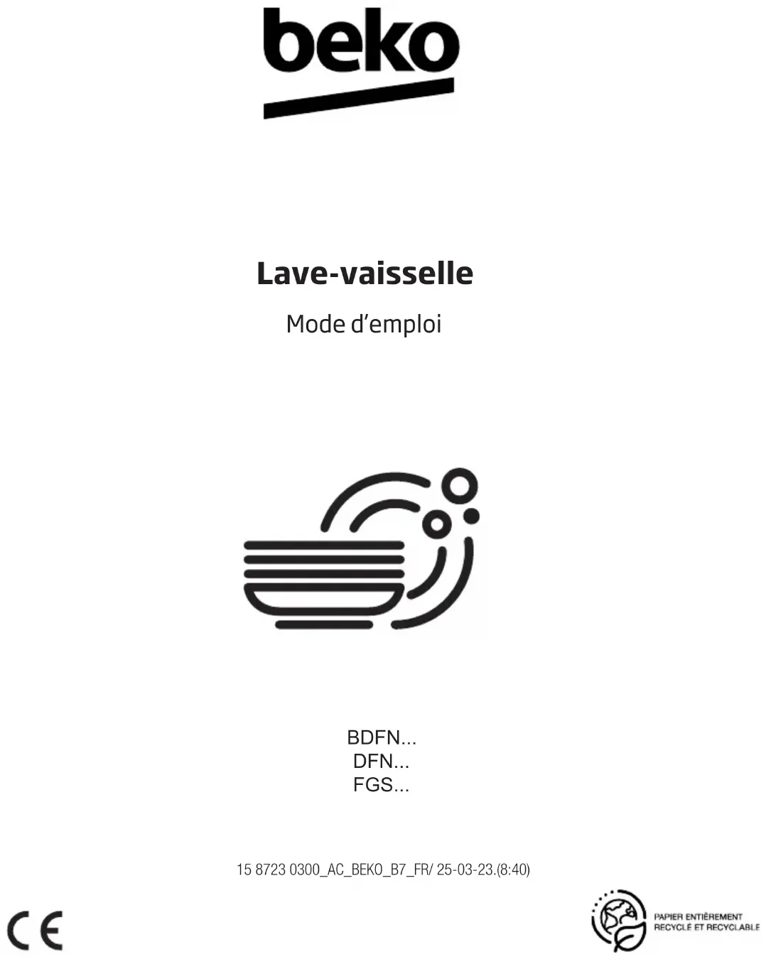 Lave-vaisselle Mode d’emploi 15 8723 0300_AC_BEKO_B7_FR/ 25-03-23.(8:40) BDFN... DFN... FGS...Les symboles suivants sont utilisés dans le manuel d’utilisation et sur l’emballage : Danger pouvant entraîner des blessures voire la mort. AVIS Danger pouvant entraîner des dommages au produit ou à son environnement. Informations importantes ou conseils utiles pour l’utilisation Veuillez lire ce manuel d’utilisateur. Cher client, Veuillez lire le présent manuel d’utilisation avant d’utiliser le produit. Merci d’avoir choisi ce produit Beko. Nous espérons que vous obtiendrez les meilleurs résultats avec notre produit fabriqué à partir d’une technologie de pointe et de matériaux de qualité supérieure. C’est pourquoi nous vous recommandons, avant d’utiliser ce produit, de lire attentivement ce manuel et tous les autres documents fournis. Veillez à bien respecter les consignes et les instructions figurant dans le manuel d’utilisation. Ainsi, vous pouvez vous protéger et protéger votre produit contre les dangers potentiels. Veuillez conserver ce manuel d’utilisateur. Si vous confiez le produit à quelqu’un d’autre, n’oubliez pas de lui remettre également le manuel d’utilisation. Ce produit a été fabriqué conformément aux conditions écologiques les plus récentes.TABLE DES MATIÈRES