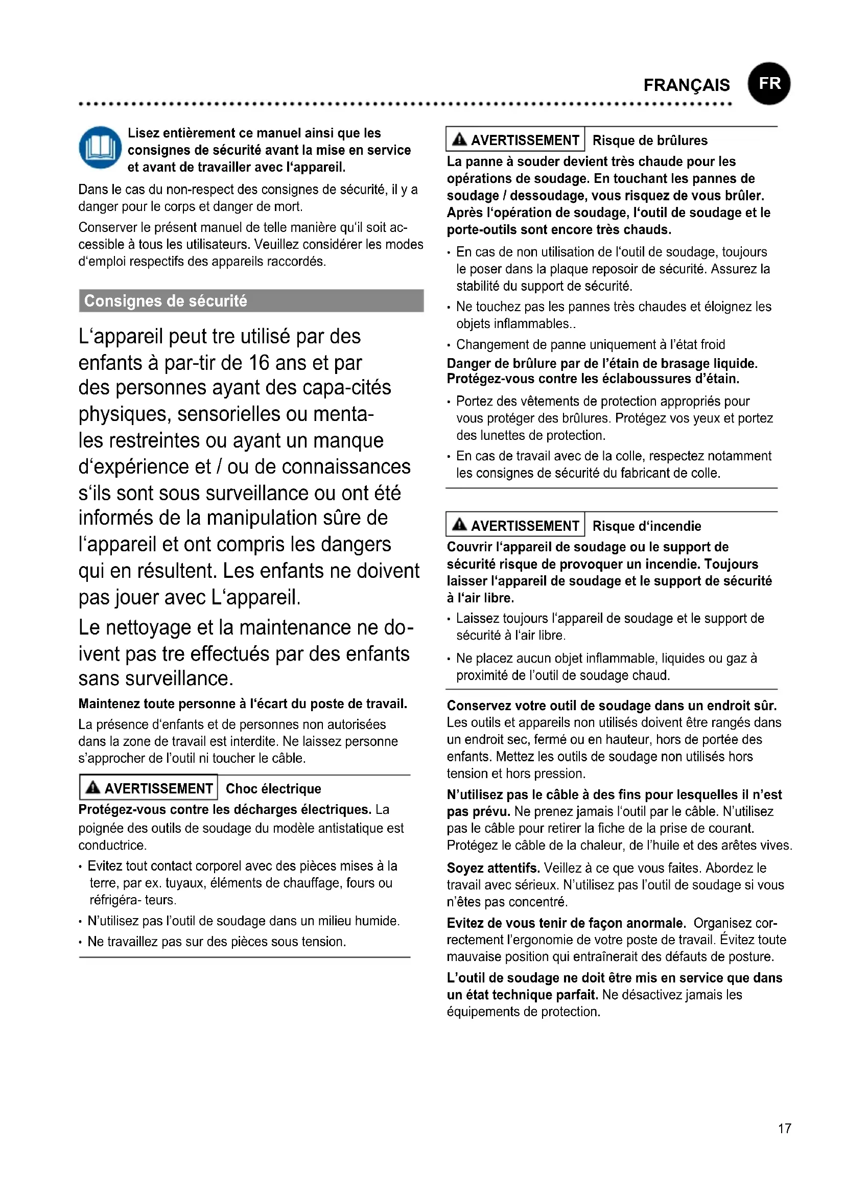 ivent pas tre effectués par des enfants sans surveillance. Maintenez toute personne à l‘écart du poste de travail. La présence d‘enfants et de personnes non autorisées dans la zone de travail est interdite. Ne laissez personne s’approcher de l’outil ni toucher le câble. AVERTISSEMENT Choc électrique Protégez-vous contre les décharges électriques. La poignée des outils de soudage du modèle antistatique est conductrice.