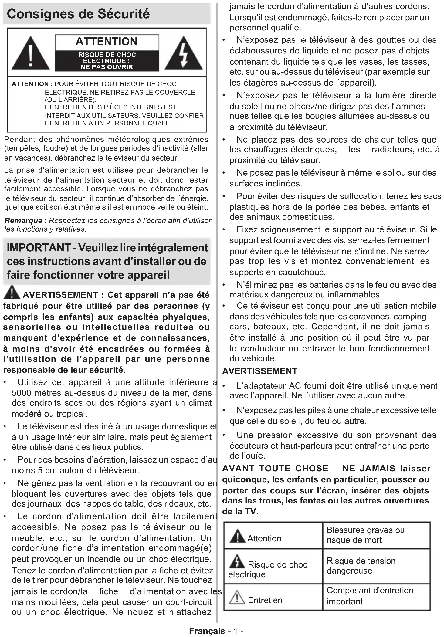 - Ce téléviseur est conçu pour une utilisation mobile dans des véhicules tels que les caravanes, camping- cars, bateaux, etc. Cependant, il ne doit jamais être installé à une position où il peut être vu par le conducteur ou entraver le bon fonctionnement du véhicule. AVERTISSEMENT