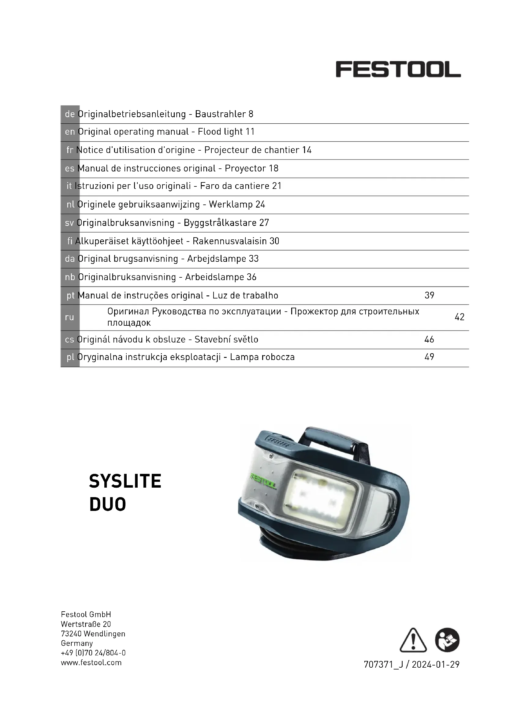 Retrouvez gratuitement la notice de l'appareil SYSLITE DUO FESTOOL au format PDF.