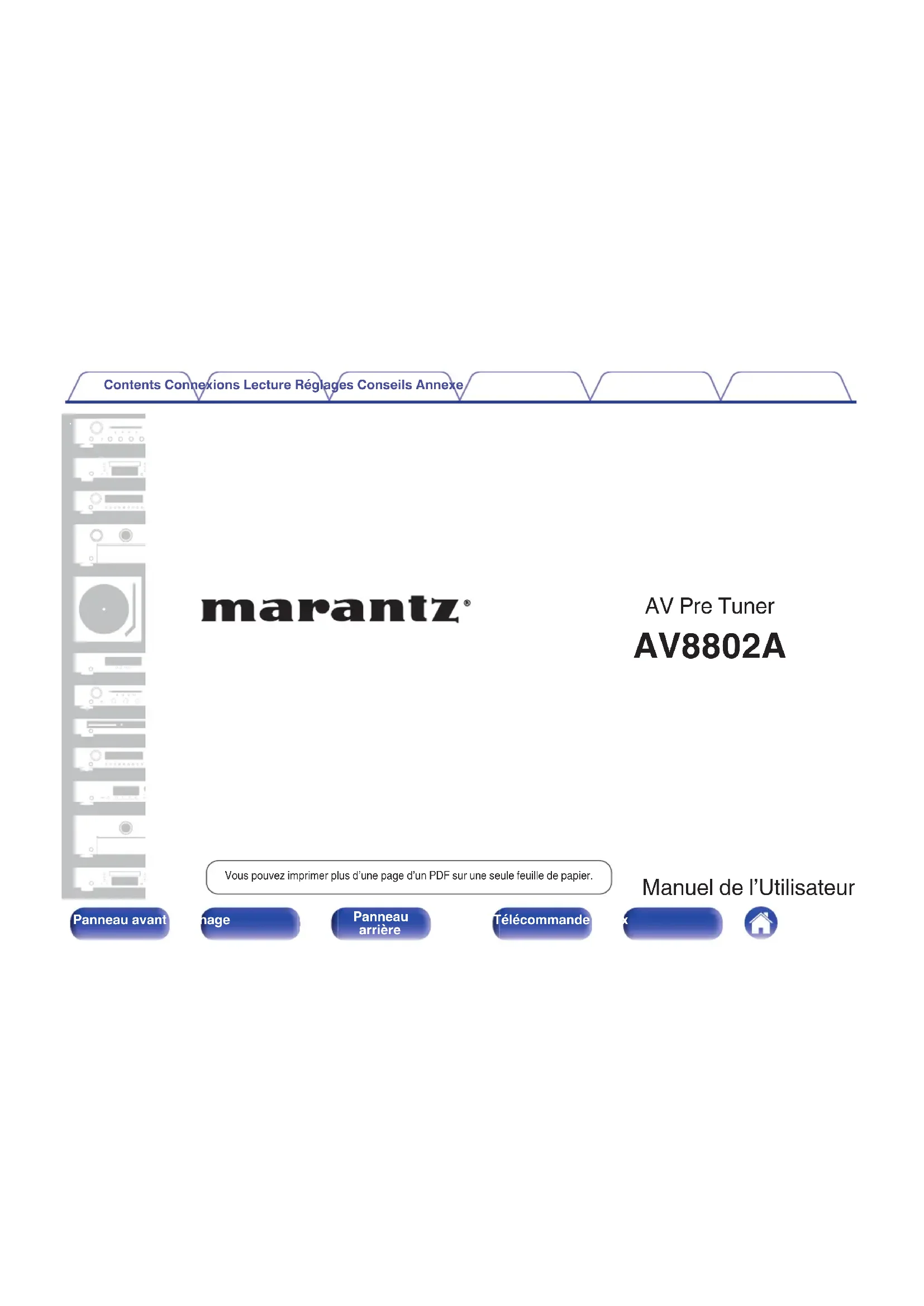 AV Pre Tuner AV8802A Manuel de l’Utilisateur Vous pouvez imprimer plus d’une page d’un PDF sur une seule feuille de papier. Contents Connexions Lecture Réglages Conseils Annexe
